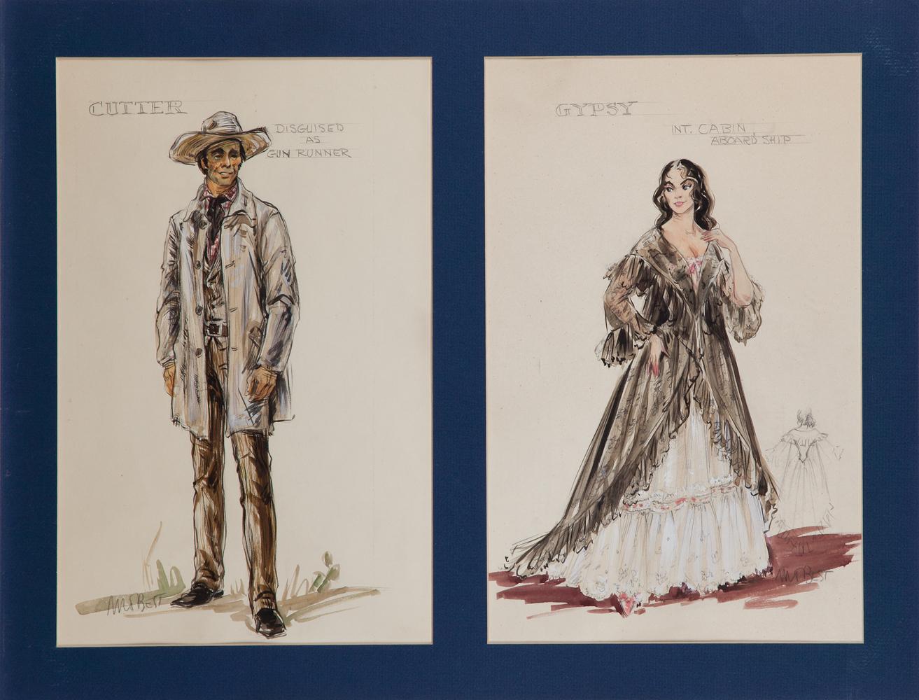 (20th Century-Fox, 1961) (2) Pencil, pen & ink, watercolor, and gouache designs on 11.5 x 17” 1-ply illustration paper, executed and pencil-signed by Marjorie Best, renowned principally for her western-themed film work such as Giant and Rio Bravo. Represented are John Wayne and Ina Balin, the leads in this Michael Curtiz-directed film. Sketches are both in Very Fine condition, apart from being mounted side-by-side into a double-opening mat with masking tape.