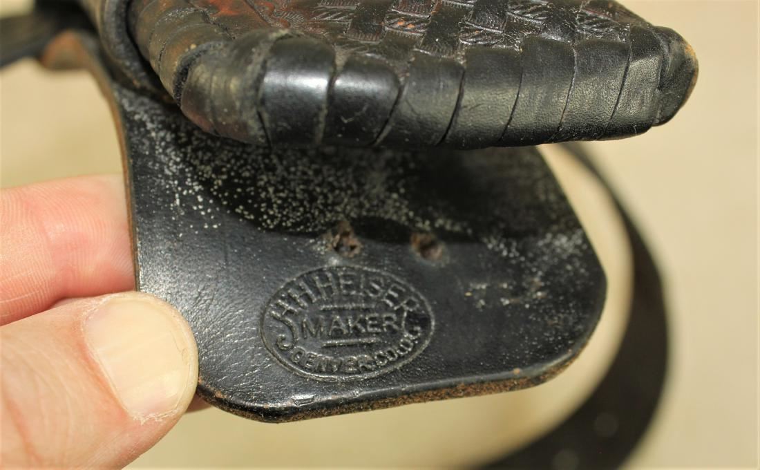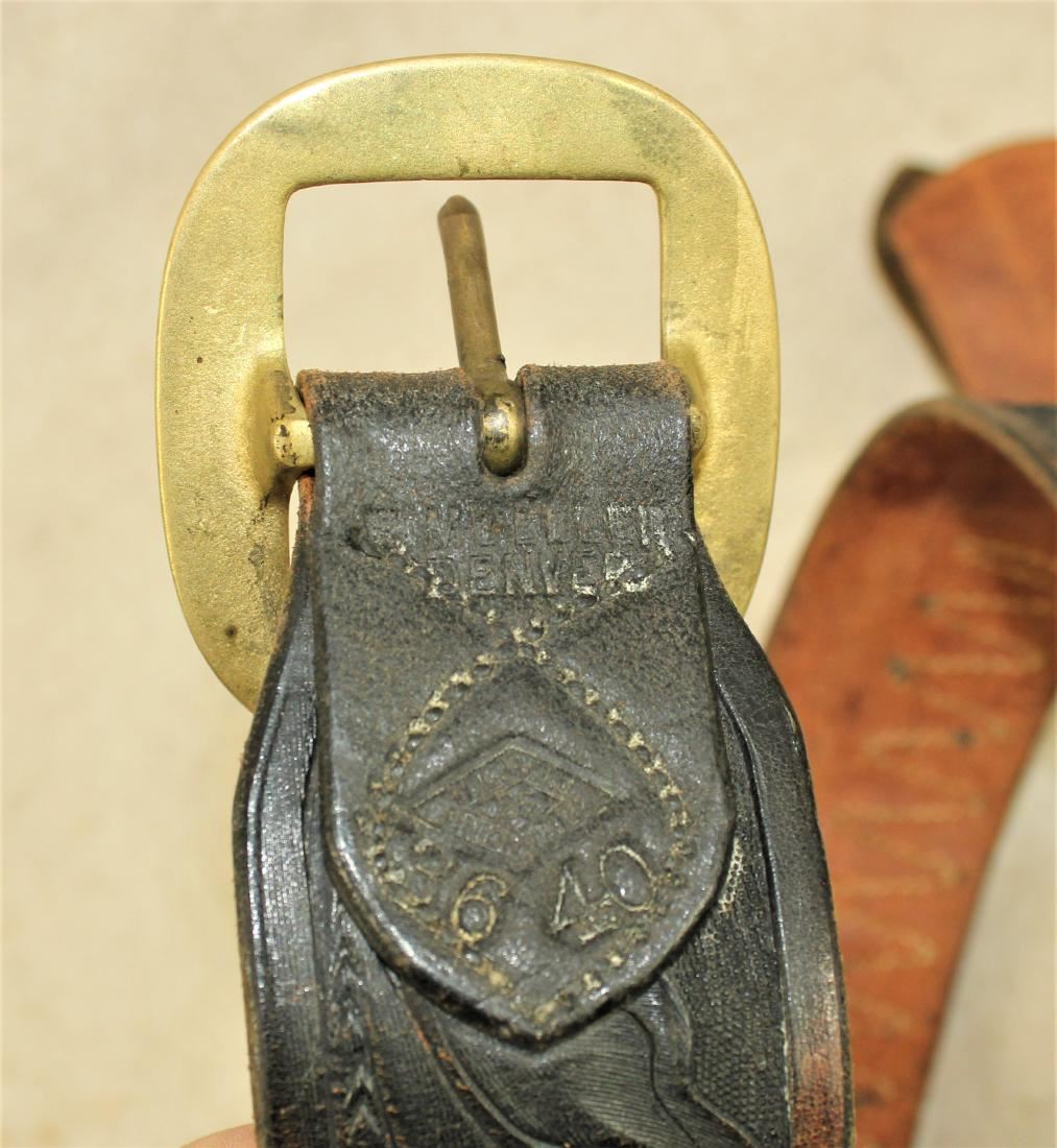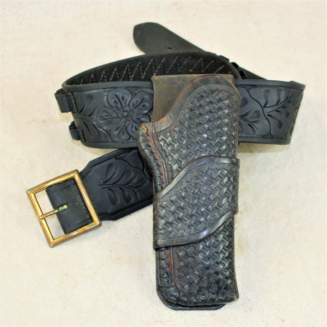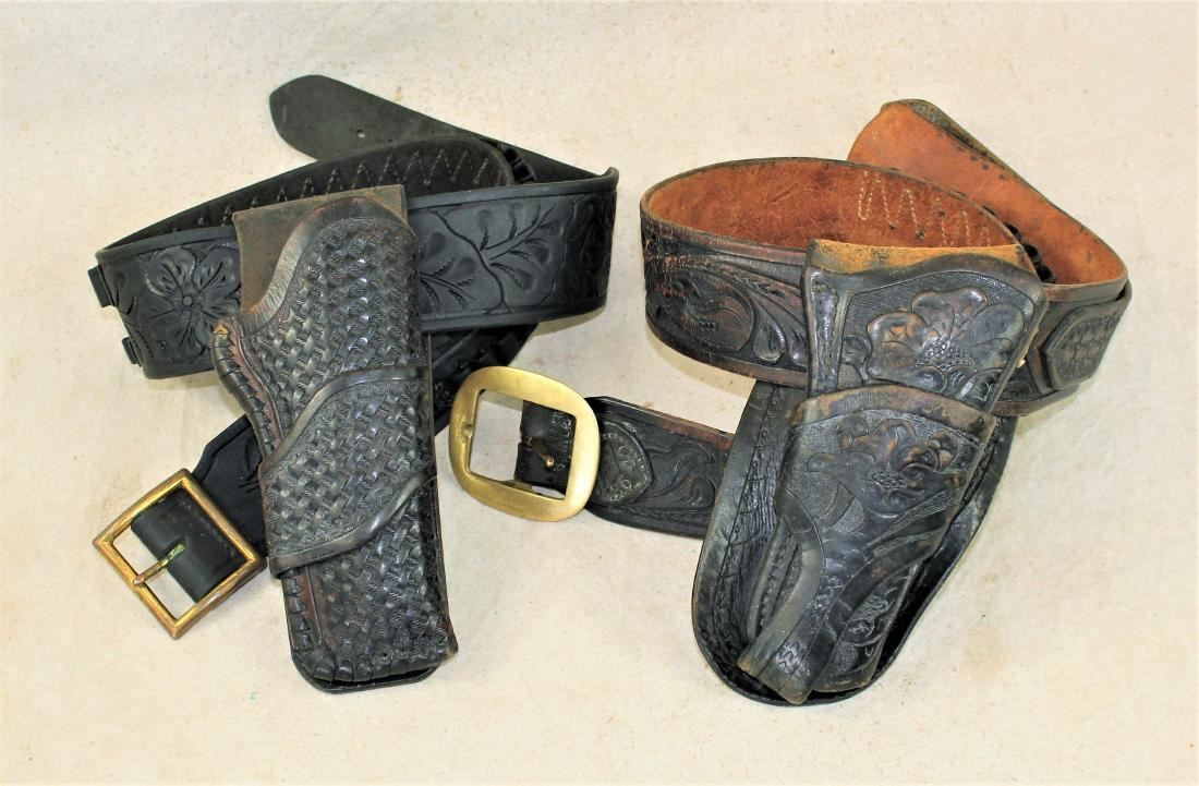 Two very nice fully tooled gun rigs. 1) Colt SAA 4 3/4" jockstrap holster with maker marked Fred Mueller large caliber cartridge belt. 2) Colt SAA 4 3/4" Heiser marked single loop holster with tooled cartridge belt having double row of loops.