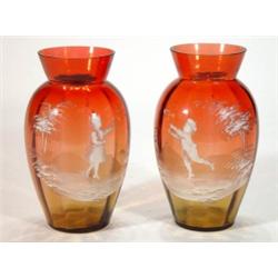 Pair of Mary Gregory green and cranberry glass vases hand enamelled with a boy and girl amongst woodland, 16cm high