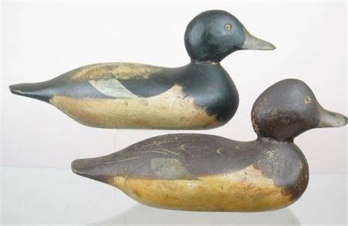 Pair of Mason Factory, Detroit Grade, Glass Eye broadbill in OP. Drake has 1/3 of the original filler cracked and missing, a narrow bottom check with a line of overpaint along the check. Hen has a few line checks on the body and one on the left side of the head, and a knot near the tail. Paint on the back of the head is crazing and a few chips are missing. Both have a coat of varnish that has yellowed. (decoy)