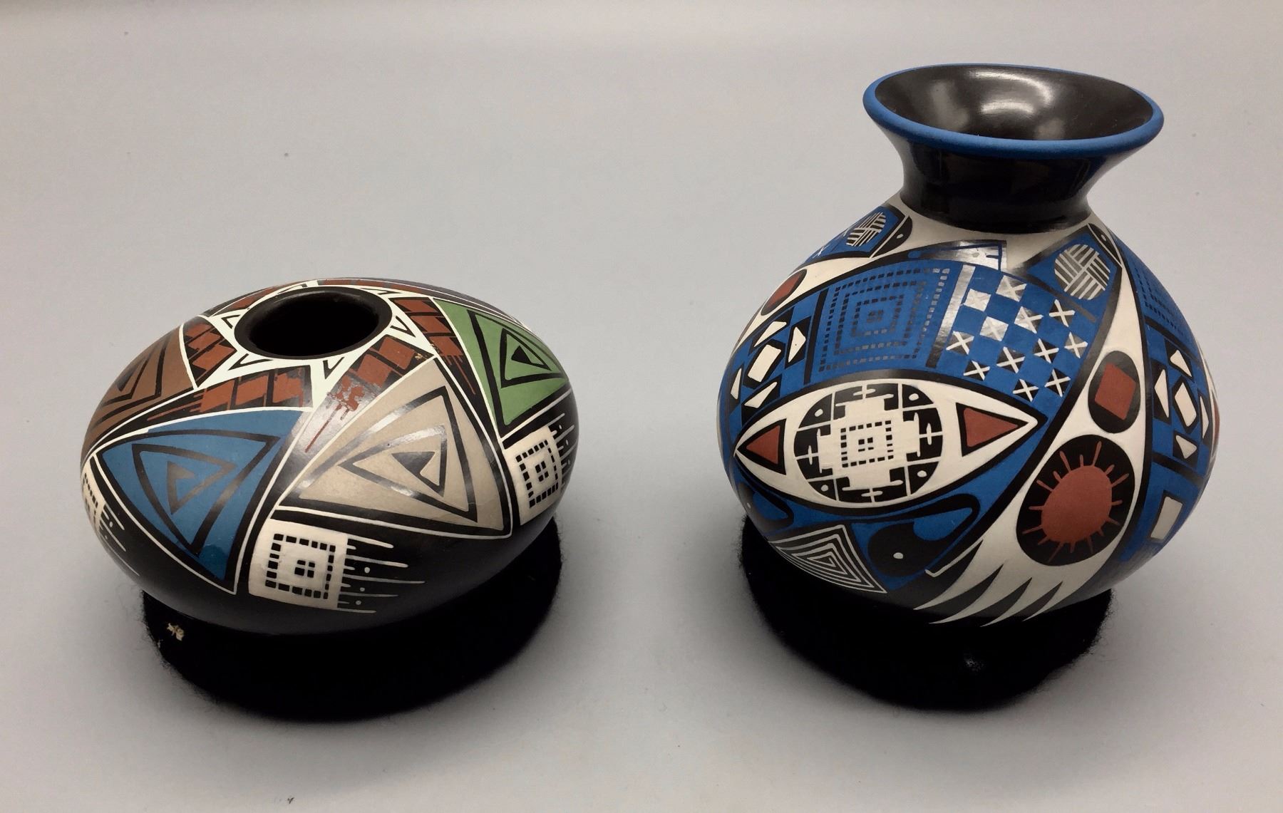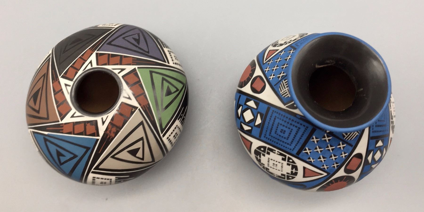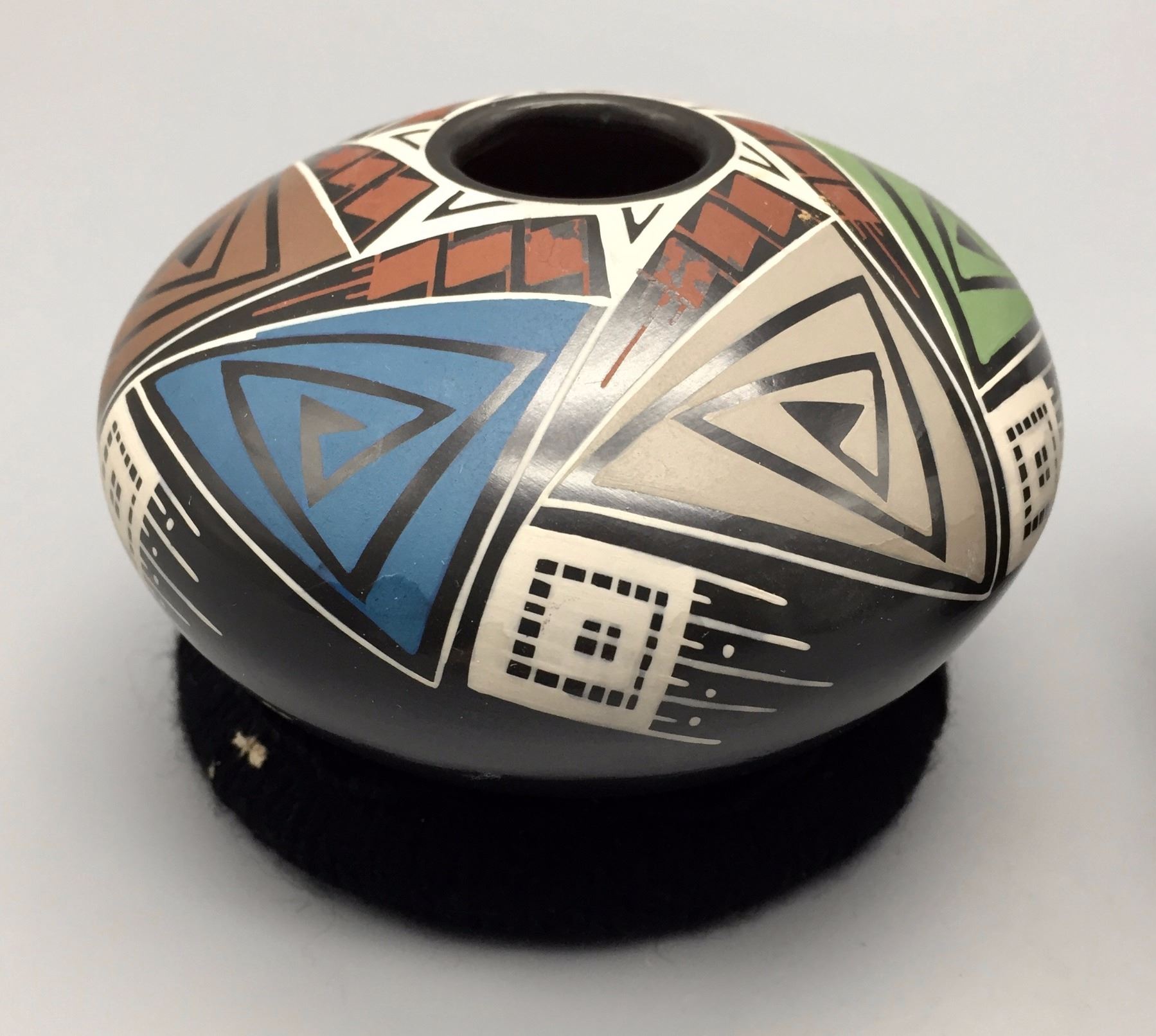 Maker: Oscar Quezada. Approx. Age: Circa 1980s. Size: 4” x 2.5” and 3.75” x 4”. Additional Info: Nice polychrome Mata Ortiz pots. Condition: Good for their age, normal wear expected. Please look closely at the pictures - they are an important part of our description. Shipping: There will be a $8 handling / packaging fee for shipping this lot. The actual cost of postage will be added on top of that.