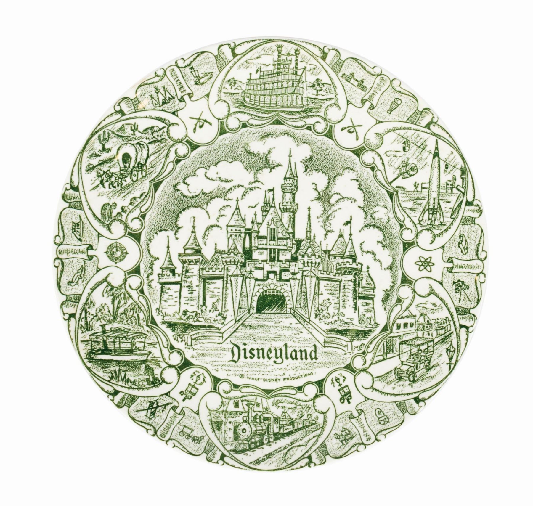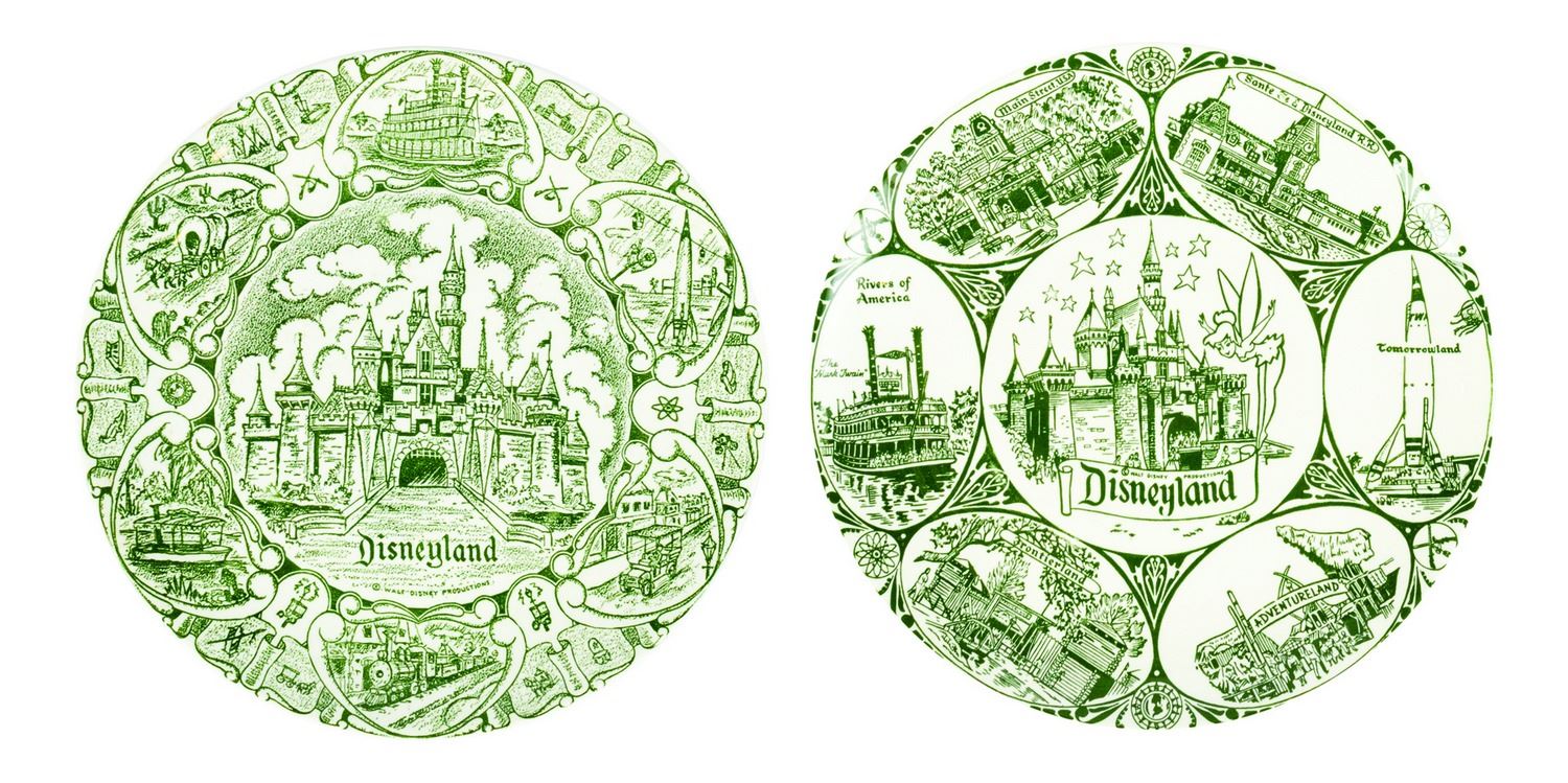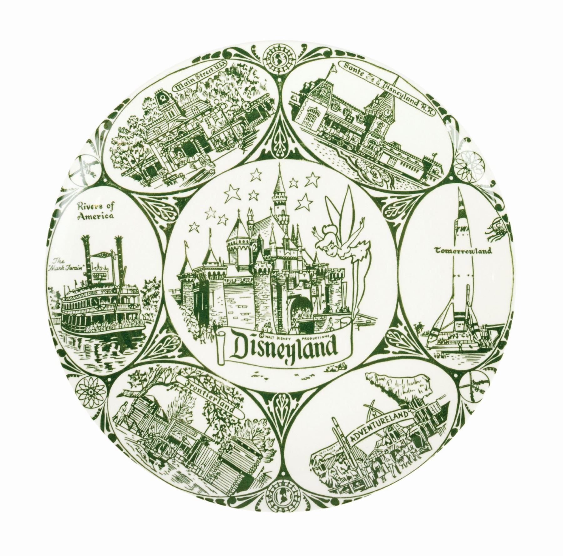 (Disneyland, c.1960s) A pair of green and white Disneyland plates featuring the various attractions and lands of the park. These rare plates measure 9.5" in diameter and are in very good condition with minor wear.