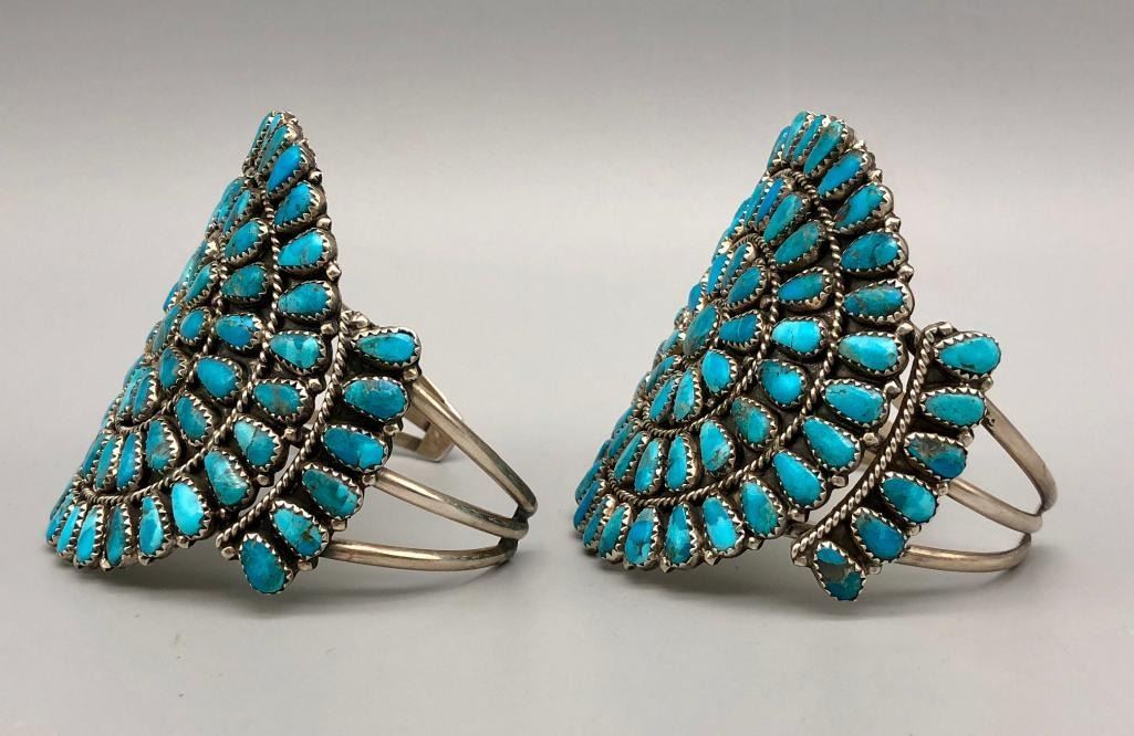 For sale in this lot is a pair of matching turquoise cluster bracelets. This is a stunning matching set that features deep blue turquoise stones, cut into petit point (teardrop) shapes. It has fine twisted silver wire between each rows and is stamped as sterling silver. MAKER: Hallmarked RT. APPROX AGE: Circa 1970s. SIZE: Both different slightly in size. Both inside circumferences are 5-5/8 inches. Opening are additional 1-5/8 inches and 1-1/8 inch wrist. Fitting a 6-1/4 inch wrist and the other fits a 6-3/4 inch wrist. Widths are 2-3/4 inches. Weighs 106.6 grams. CONDITION: Good for their age, normal wear expected. Please look closely at the pictures as they are an important part of our description and are hereby incorporated into the description, specifically with regards to condition. SHIPPING: There will be a $5 handling / packaging fee for shipping this lot. The actual cost of postage will be added on top of that. BUY IT NOW: If you would like to buy this item now, without waiting for the auction day to bid on it, we do offer this option (which is available up to 48 hours before the actual auction starts). The “Buy it Now†price is the high estimate of this lot (plus applicable fees and the Buyer's premium is discounted to 10% when using the Buy it Now option). If you would like to exercise this option, you must contact us by email (or phone as long as you talk to someone live). Reference this lot number and your intention to "Buy it Now."