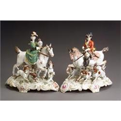 Modeled as a gentleman with a horn and a lady falconer; each flanked by four detachable hounds on a terrain molded base. The first with underglaze blue crossed swords mark flanked by dates 1710 and 1910; and incised numeral T 102; the second incised 132. Six hounds with underglaze blue crossed swords mark. Several hounds with restorations to tails; one with loss to one ear; one with broken leg; one with restored front legs.