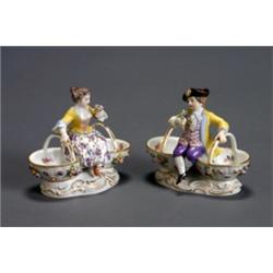 Each figure in a yellow coat flanked by floral encrusted basket-form salt cellars. Each with underglaze blue crossed swords mark, incised 3024 and impressed 60. Girl lacking one foot; restoration to hat and hand of boy.