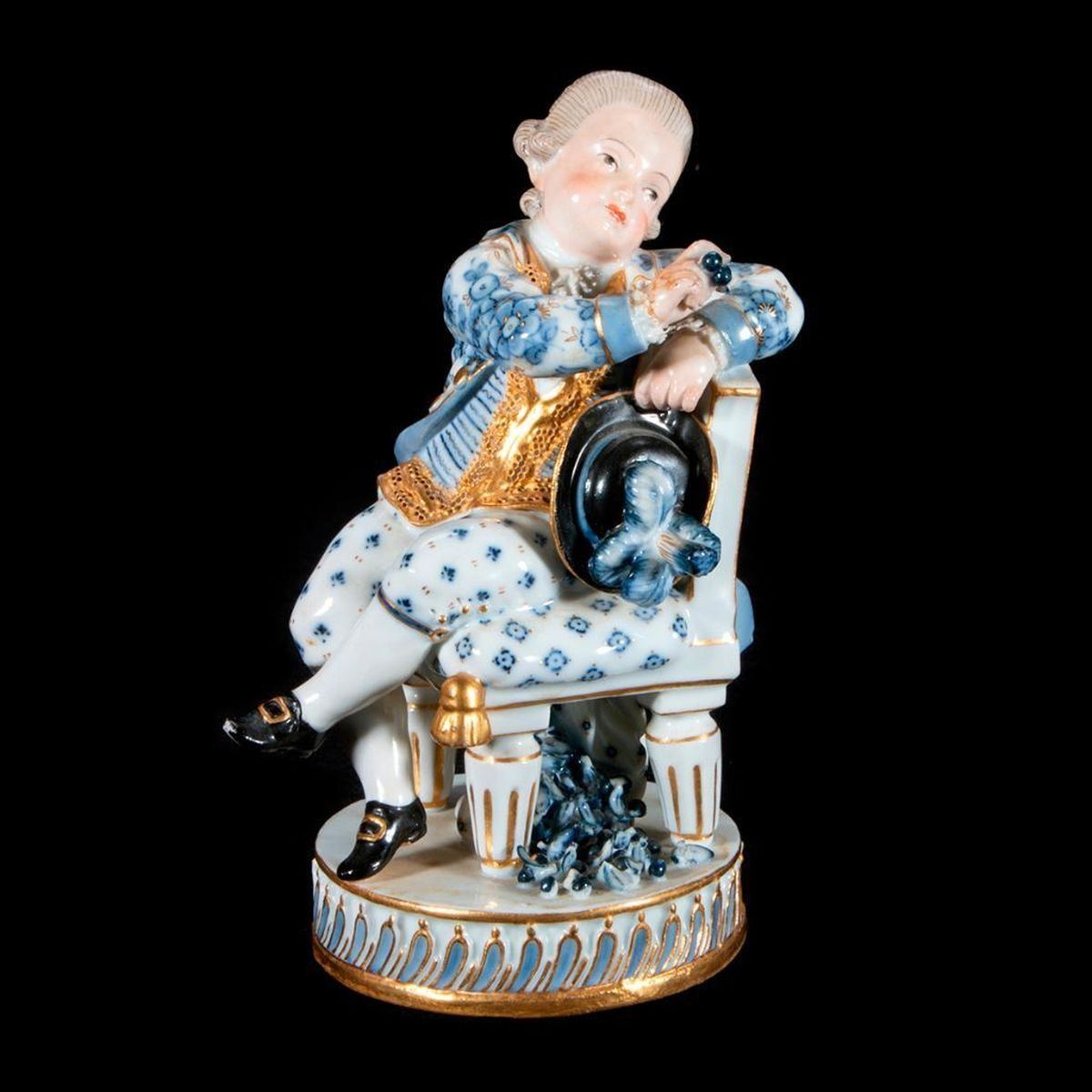 A fine pair of Meissen blue and white porcelain figures with gilt details. H- 5 1/4" Dia. base- 2 3/4" Condition: Good with old repair to gentleman's hand.