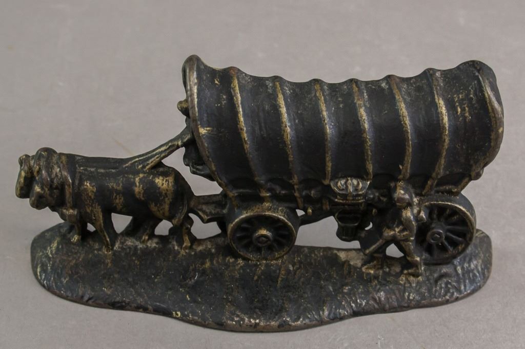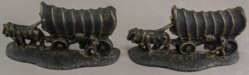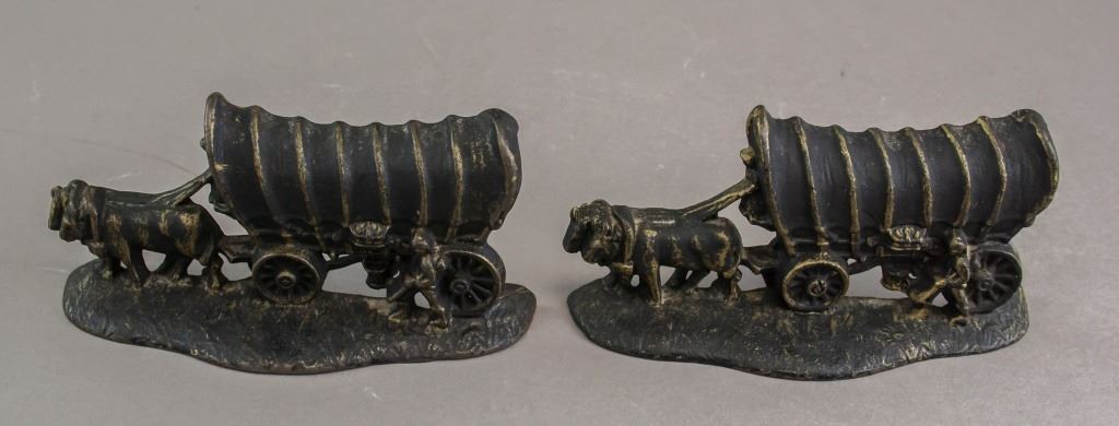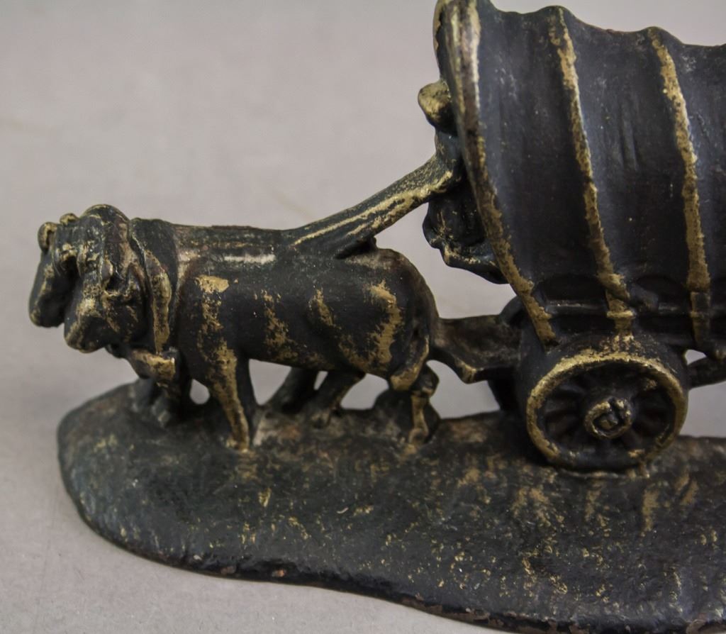 Pair of metal bookends. Featuring two ox pulling a large wagon with a figure walking alongside. 8 x 16 cm. 712 grams (total).