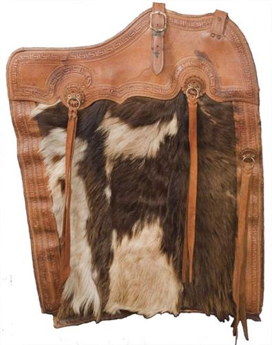 Pair of Mexican Armas. Embossed leather inset with hair on cowhide. These fit over the horn and provided the same protection to a rider as chaps. These are scarce! Early 20th century. Fine condition. (est $1,200-1,500).