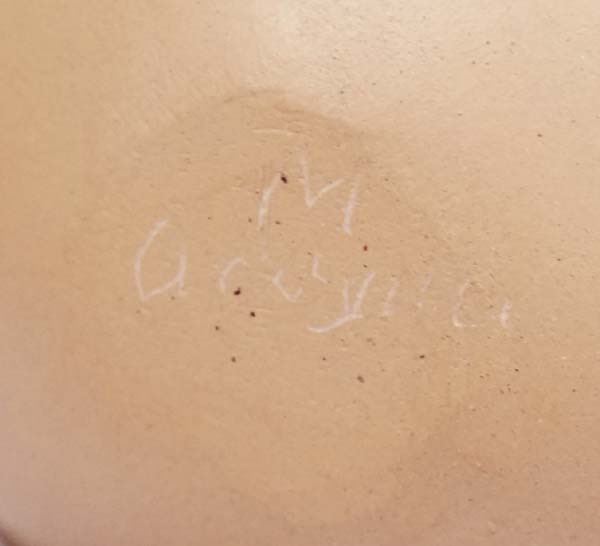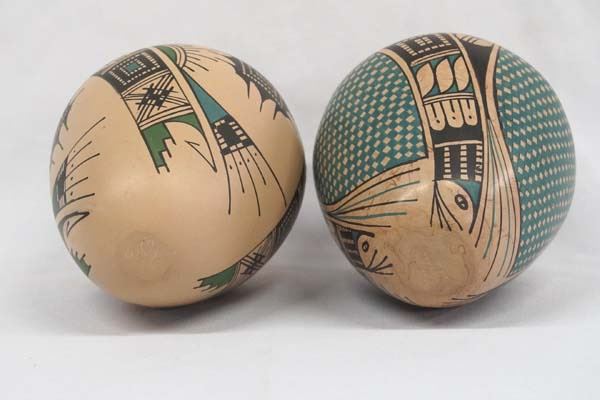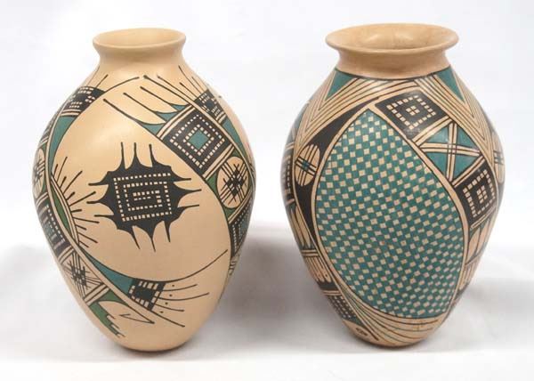 Pair of Mexican Mata Ortiz Polychrome Jars, , largest measures 6''H x 5.5''D, one is eye dazzler designs on marbleized clay by Ana Villa and the other features Paquime' inspired lines and designs by M. A. (name hard to read)