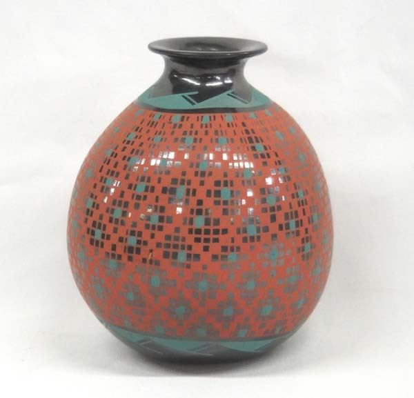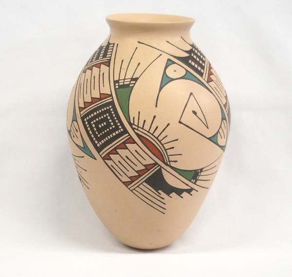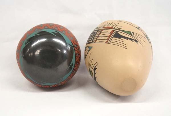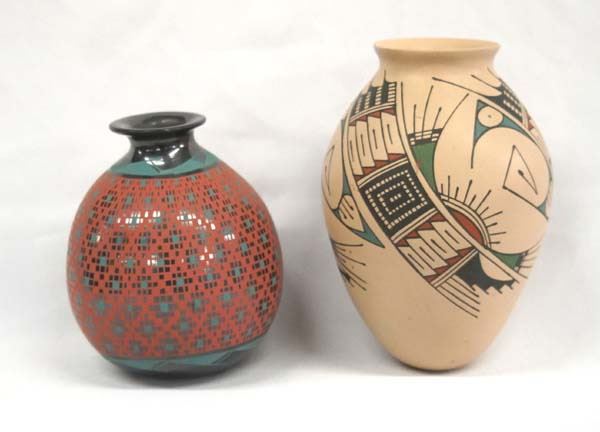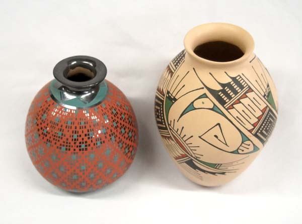 Pair of Mexican Mata Ortiz Polychrome Jars, largest measures 8''H x 5''D, features 1 eye dazzler jar by Alejandra Soto and 1 Paquime' inspired jar by Ara Villa