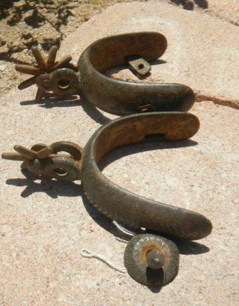 Mexican Spurs 5 by 3 and half inches. Spurs are from 1930 and have engraving- strap is missing. Spurs are not marked. Shipping $15.00 Condition Rusty