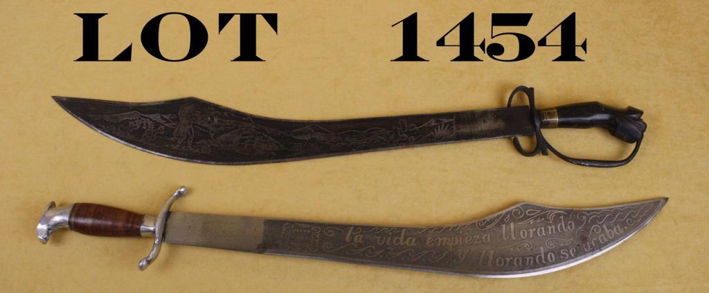 Pair of Mexican curved blade cutlasses, both approx. 28” overall with etched blades; the first shows a dark patina on metal surfaces and a carved horn grip with iron “D” guard and etching to the blade in Spanish; thesecond shows a light gray patina on the metal surfaces, aluminum cross guard and pommel and stacked leather grip and etching to the blade in Spanish. Est.: $50-$100.