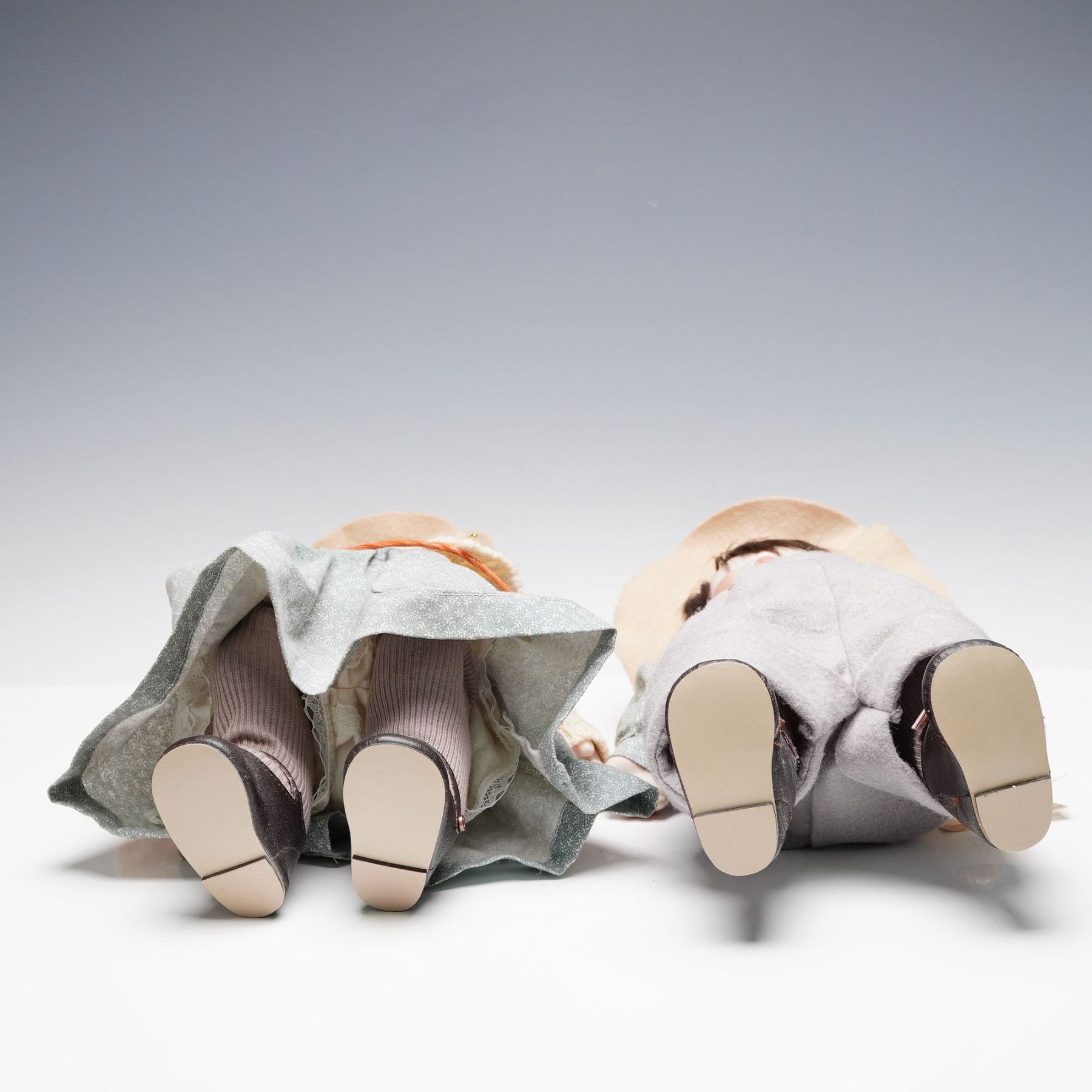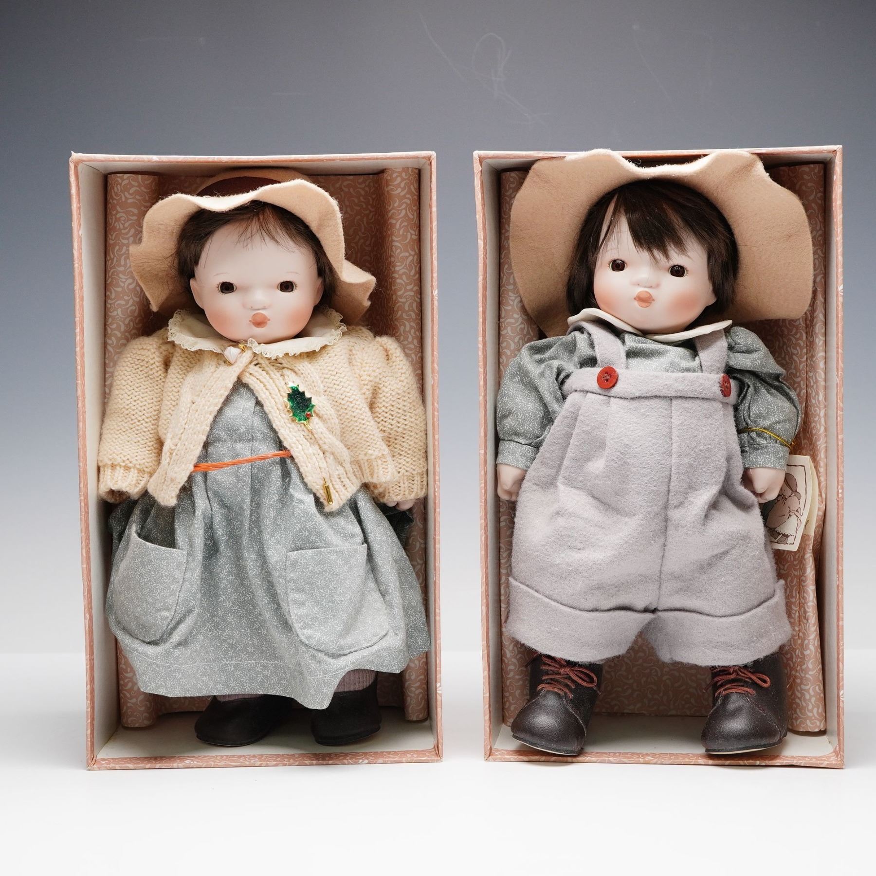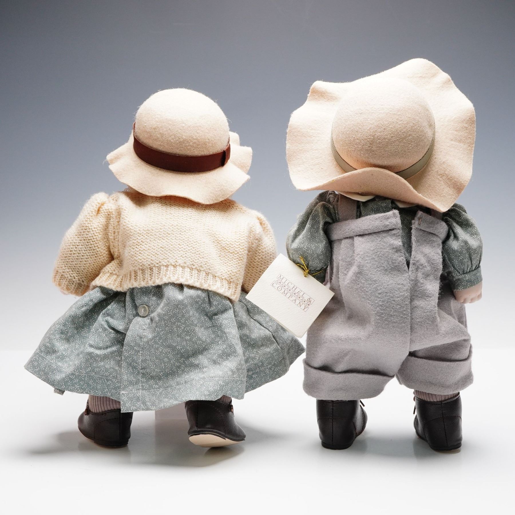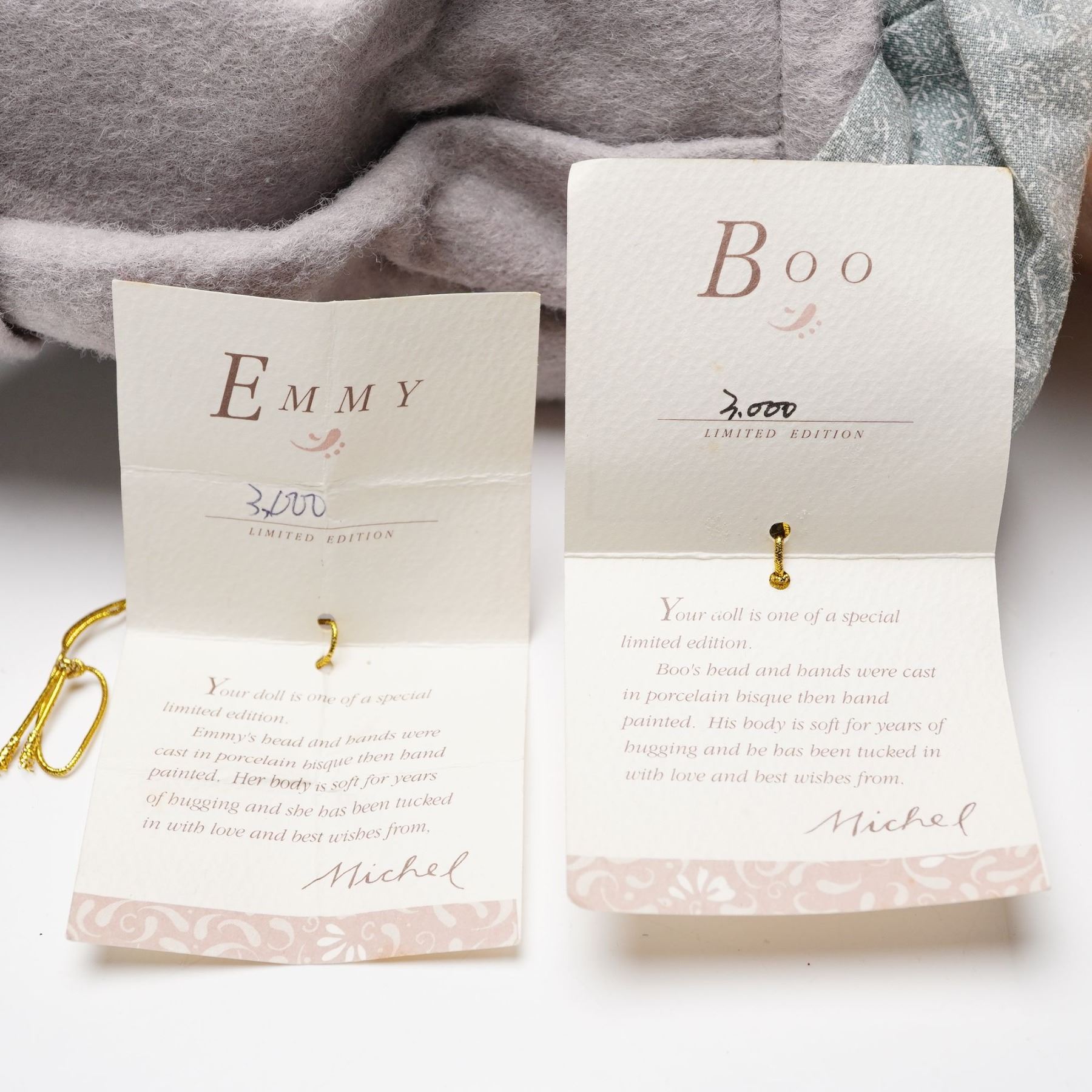Charming duo of collectible dolls by Michel & Co, featuring Emmy and Boo, each presented in their original boxes. Both dolls are dressed in period-inspired outfits with coordinating hats and finely crafted fabric clothing, complete with leather-look shoes. Each displays Michel & Co's signature attention to hand-finished detail.