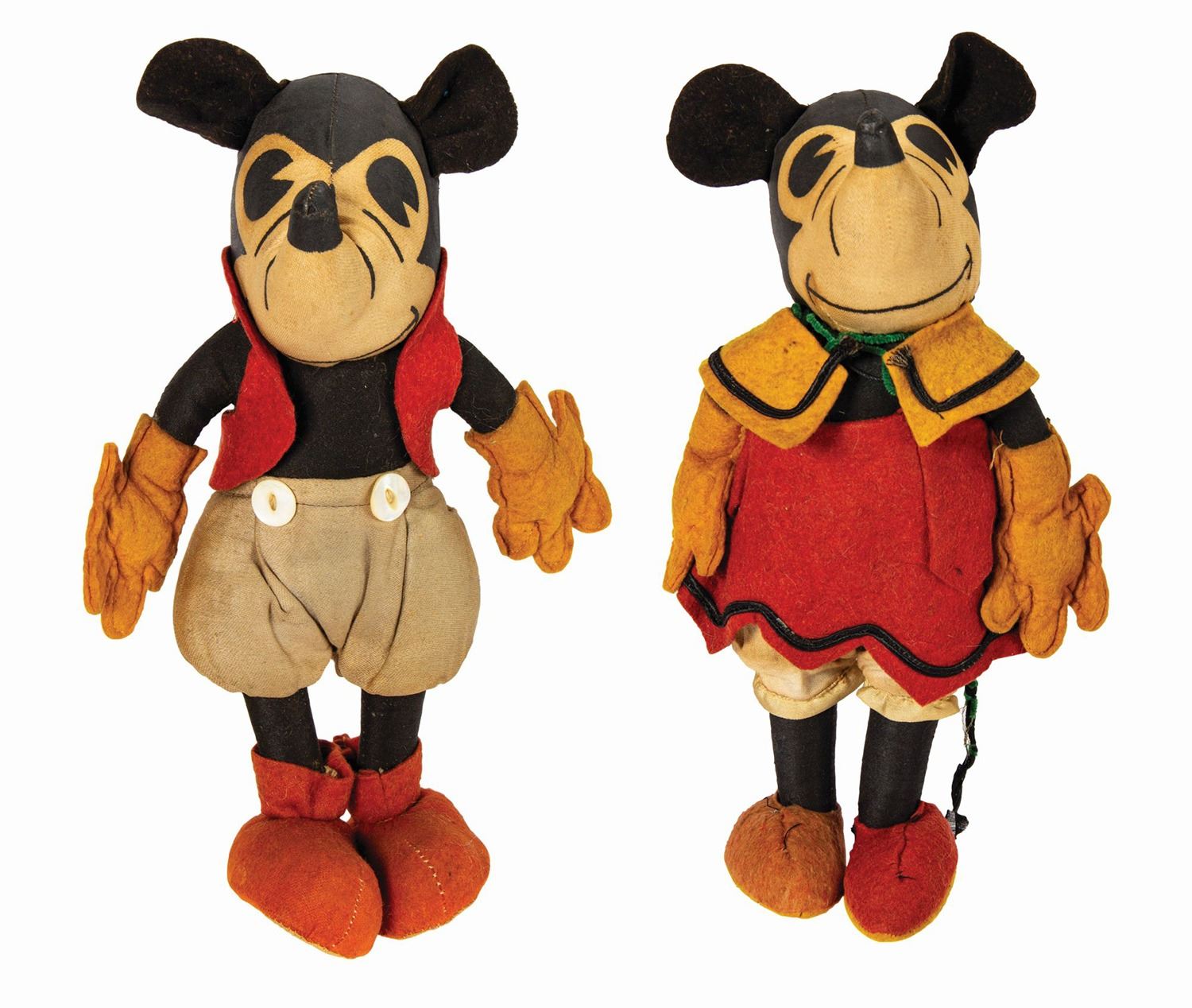 (Disney, 1930s) A pair of rare Mickey and Minnie vintage cloth stuffed dolls manufactured by Steiff. Mickey wears a felt vest, gloves, and boots, with silk trousers accented by shell buttons. The remnants of a Steiff manufacturer's stamp with design patent number 82802 are visible on the sole of his left boot. The matching Minnie doll wears a felt skirt with black piping, collar with black piping, gloves, shoes, and cotton bloomers. Measuring approximately 11" tall, the dolls are in good condition. Minnie's collar has fallen off and her left shoe hangs on by a thread. Both exhibit discoloring from age and minor soiling, but present very well for dolls from this era.