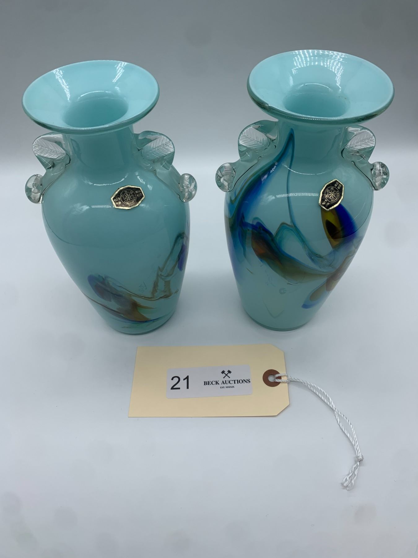 Pair of Mid Century Case Glass Snowflakes Lemonade Vases With Clear Handles 8" Inches Tall Labels