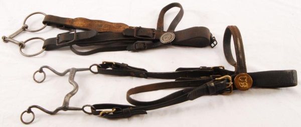 Pair of military headstalls with bits. One a packer and the other a harness bridle. Different rosettes.