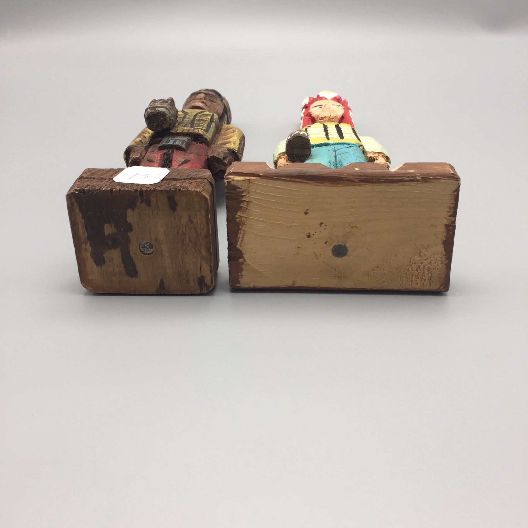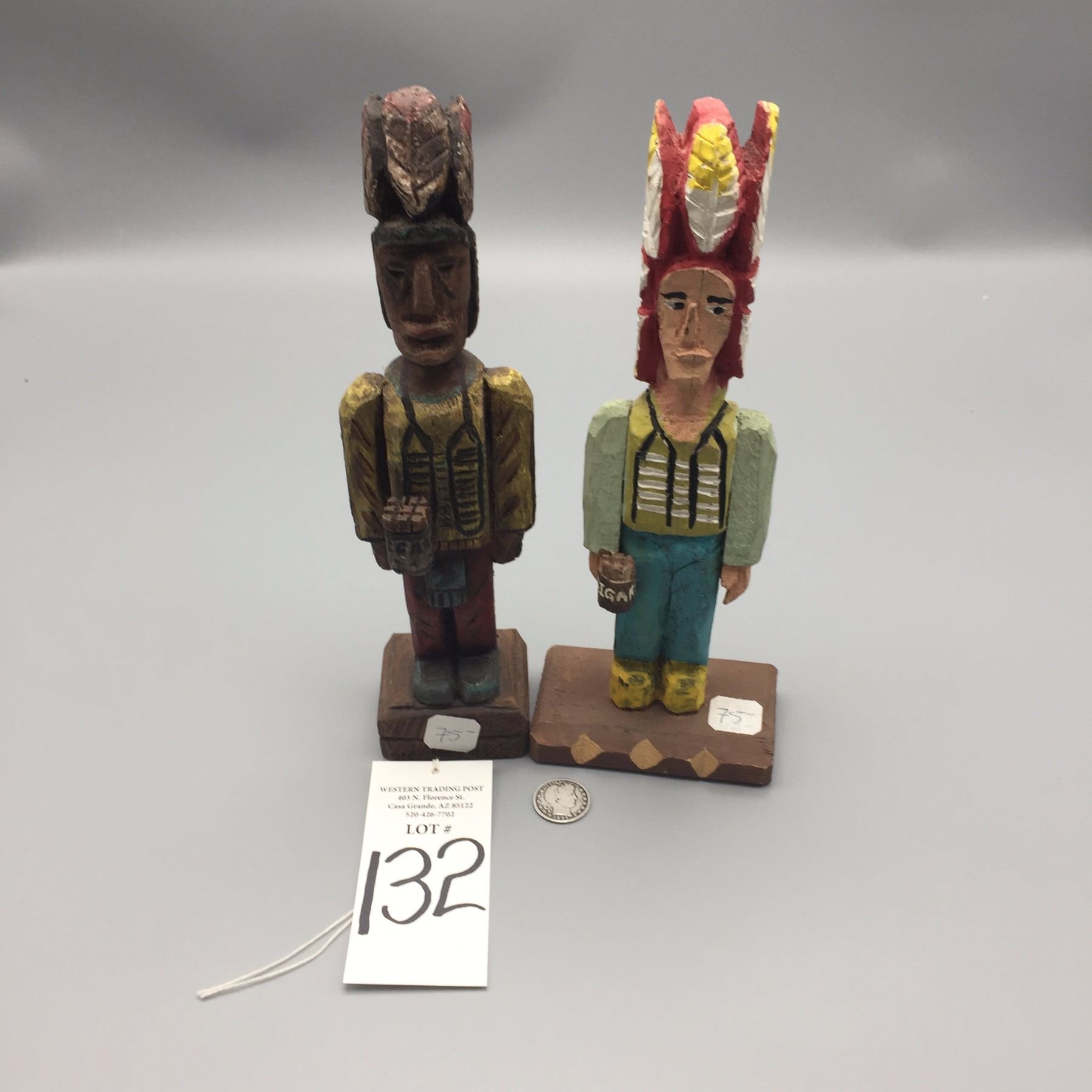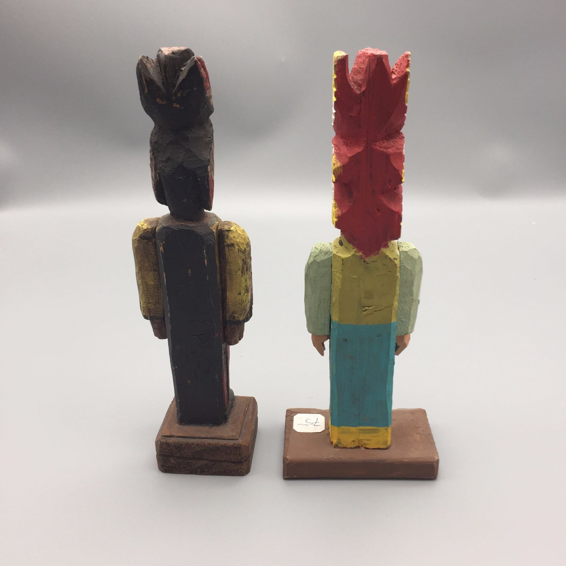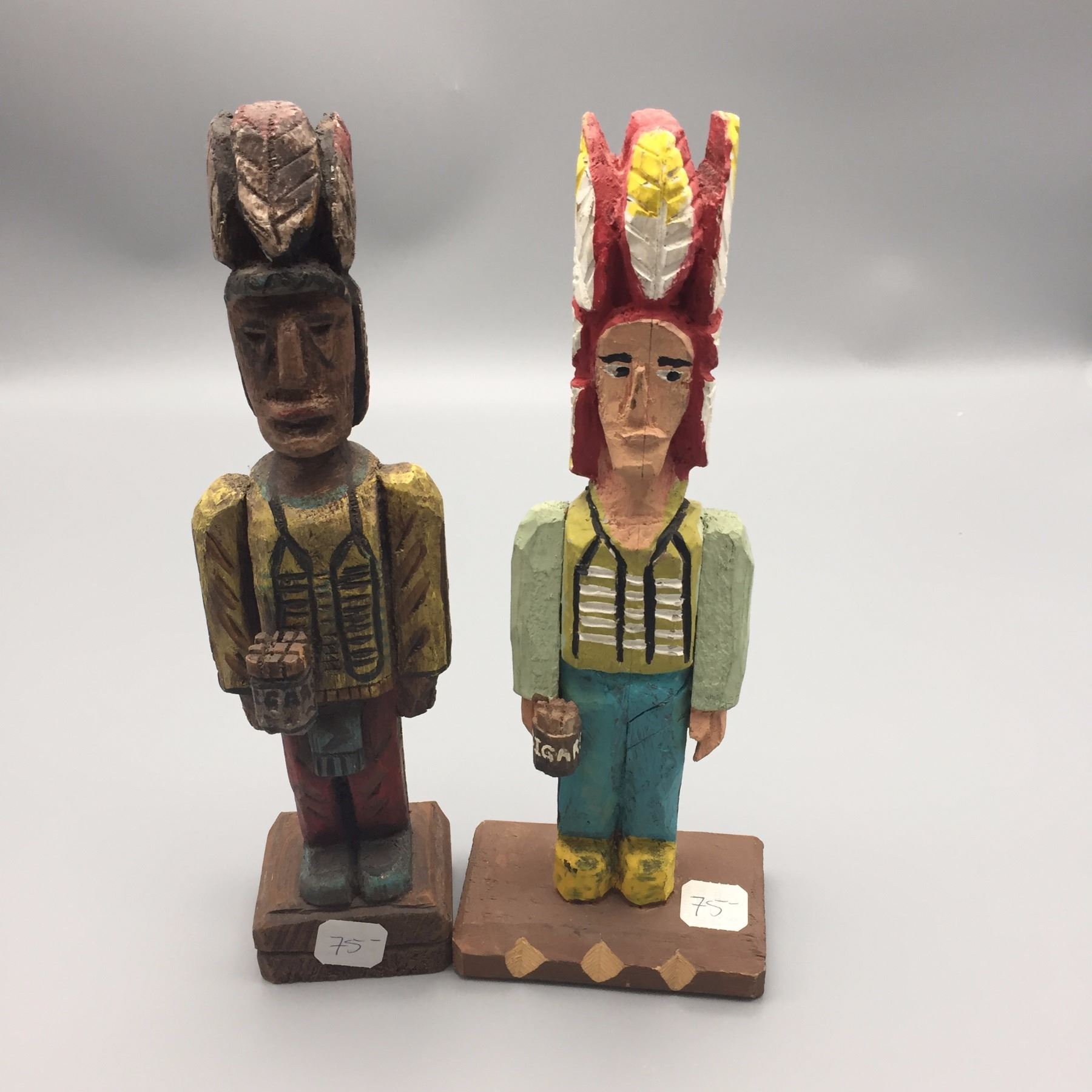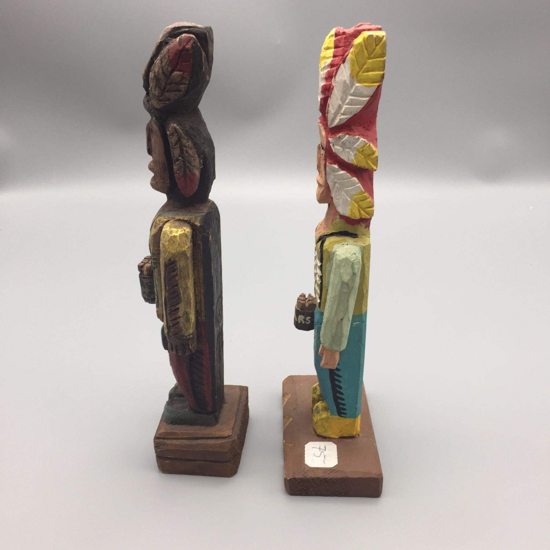 Maker: Unknown Makers. Approx. Age: Vintage. Size: 1). 4”w x 3”l x 11”h, 2). 2 1/2”w x 2”l x 11”h. Additional Info: Pair of hand carved, hand painted miniature cigar store wooden indians. Condition: Good for their ages. Please look closely at the pictures - they are an important part of our description. Shipping: There will be a $8 handling / packaging fee for shipping this lot. The actual cost of postage will be added on top of that.