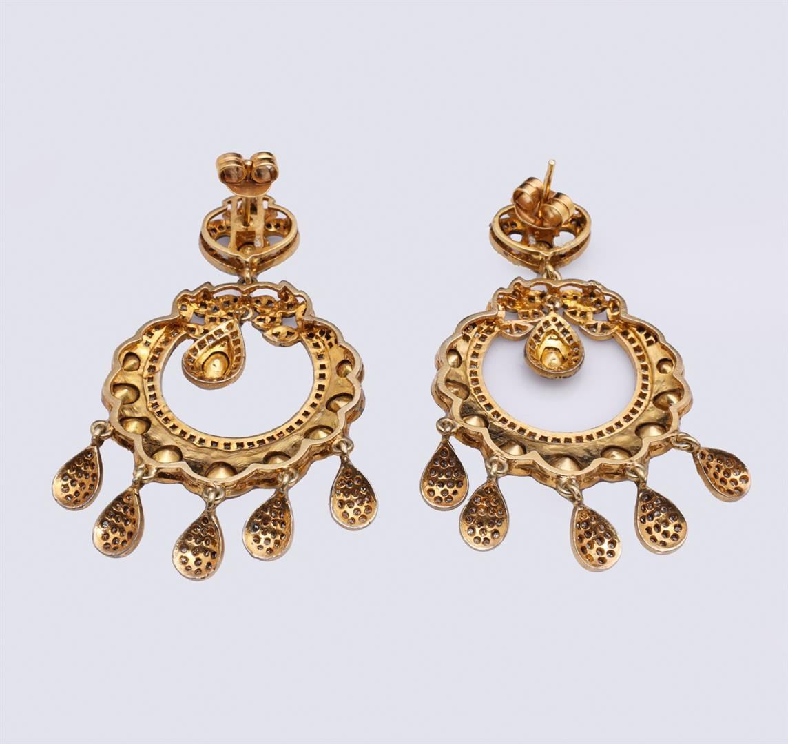 Pair of Mogul style silver topped gold earrings; each set with numerous polki diamonds; gross weight 26.3 g, each 2 1/2" x 1 3/8" (approx.)
