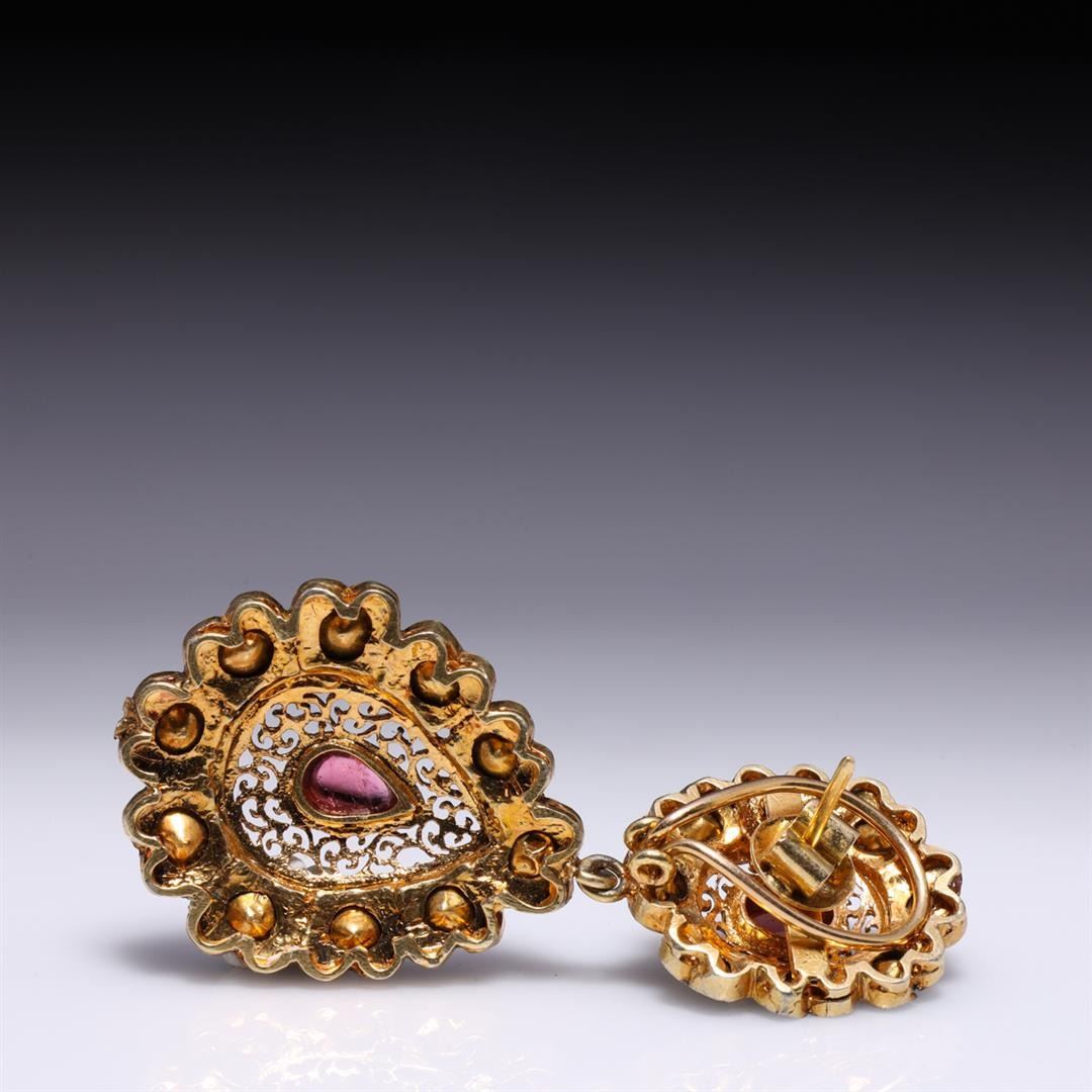 Pair of Mogul style silver-topped gold earrings; each set with two bezel set pink tourmalines and numerous polki diamonds; gross weight 24.9 g, each 2 3/8" x 1" (approx.)