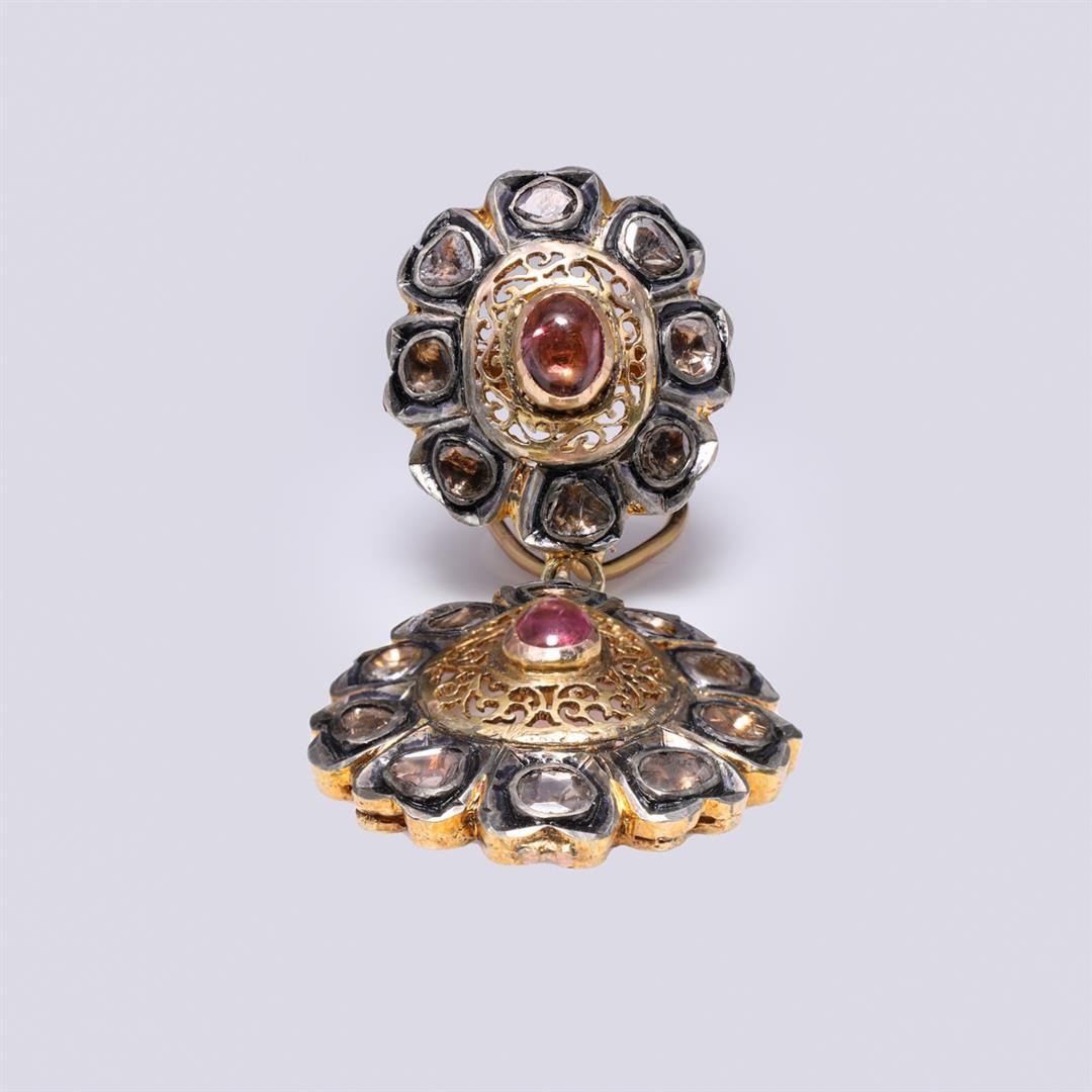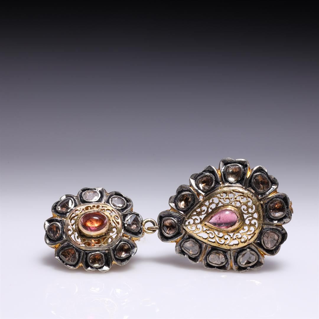 Pair of Mogul style silver-topped gold earrings; each set with two bezel set pink tourmalines and numerous polki diamonds; gross weight 24.9 g, each 2 3/8" x 1" (approx.)
