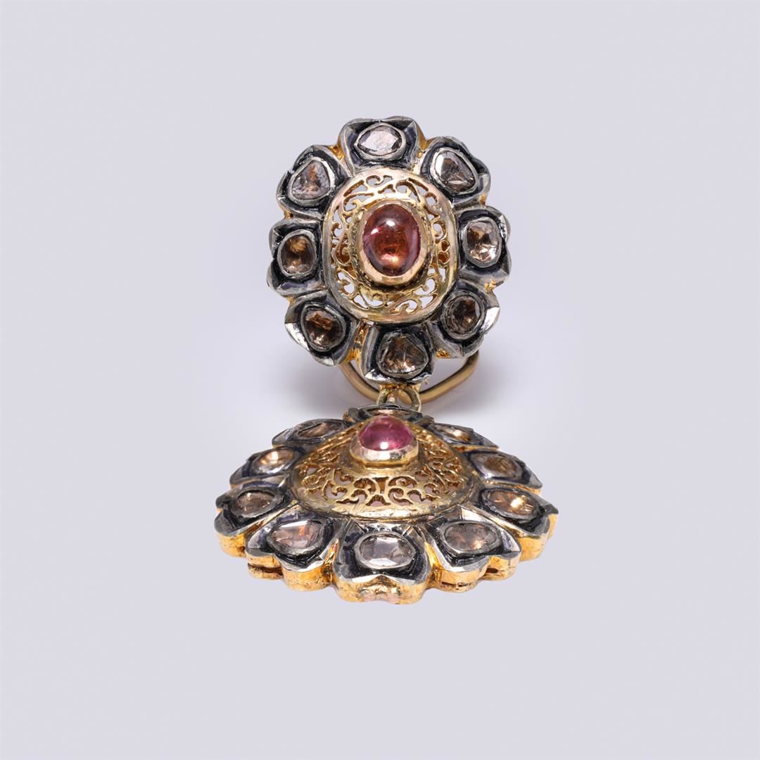 Pair of Mogul Style Silver Topped Gold Polki Diamond & Tourmaline Earrings containing diamonds and tourmaline weighing approximately 12.0 cts. Total weight is 24.8 gm. Estimated retail value $2,500.