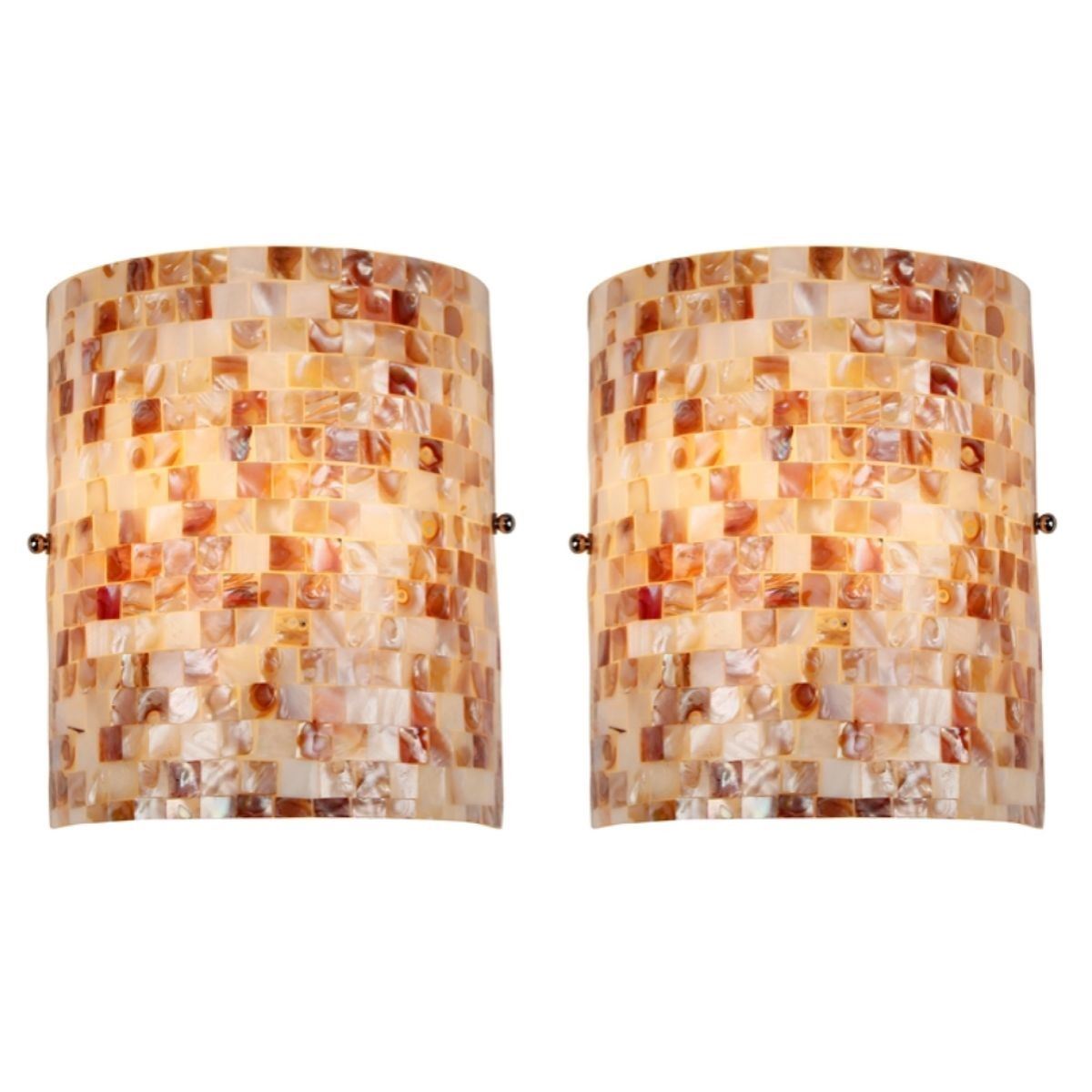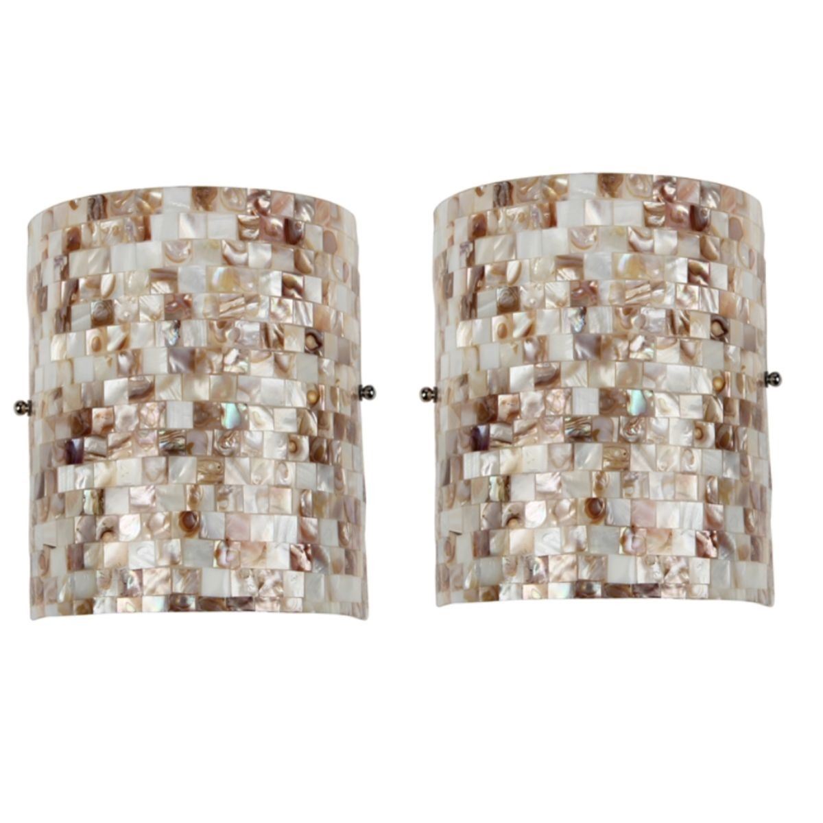 Matching pair of mosaic seashells inlaid over glass, sconce lights. 10" H X 8 1/4" W each.Â