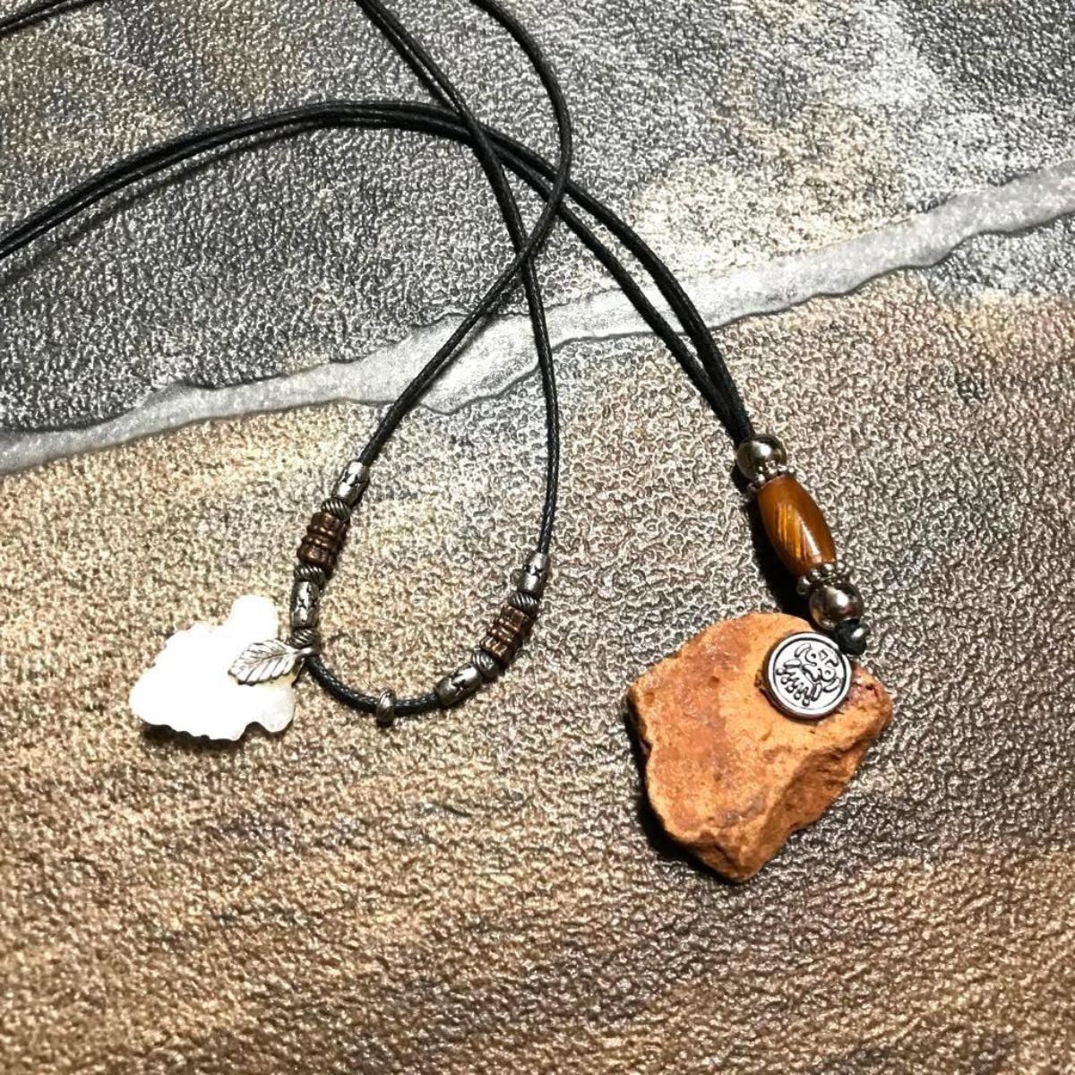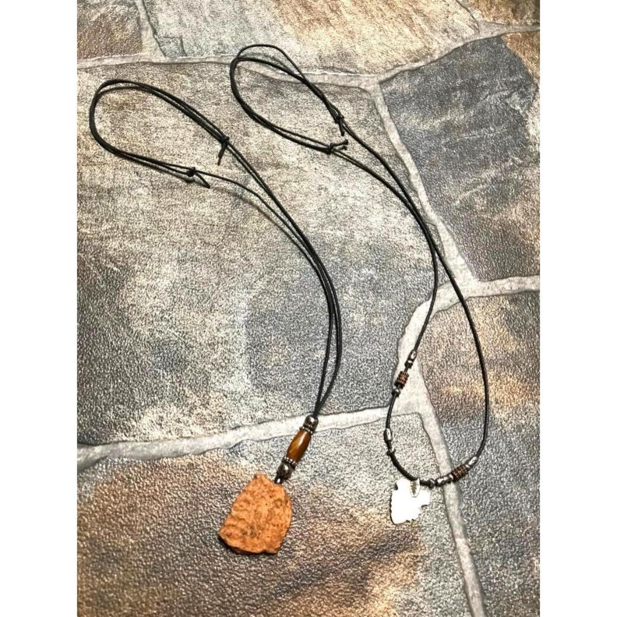 Pair of hand-crafted Native American Indian dug / found artifacts, clay earth pottery shard & quartz bird point arrowhead point, strung with decorative beads on leather cords, adjustable size necklaces.