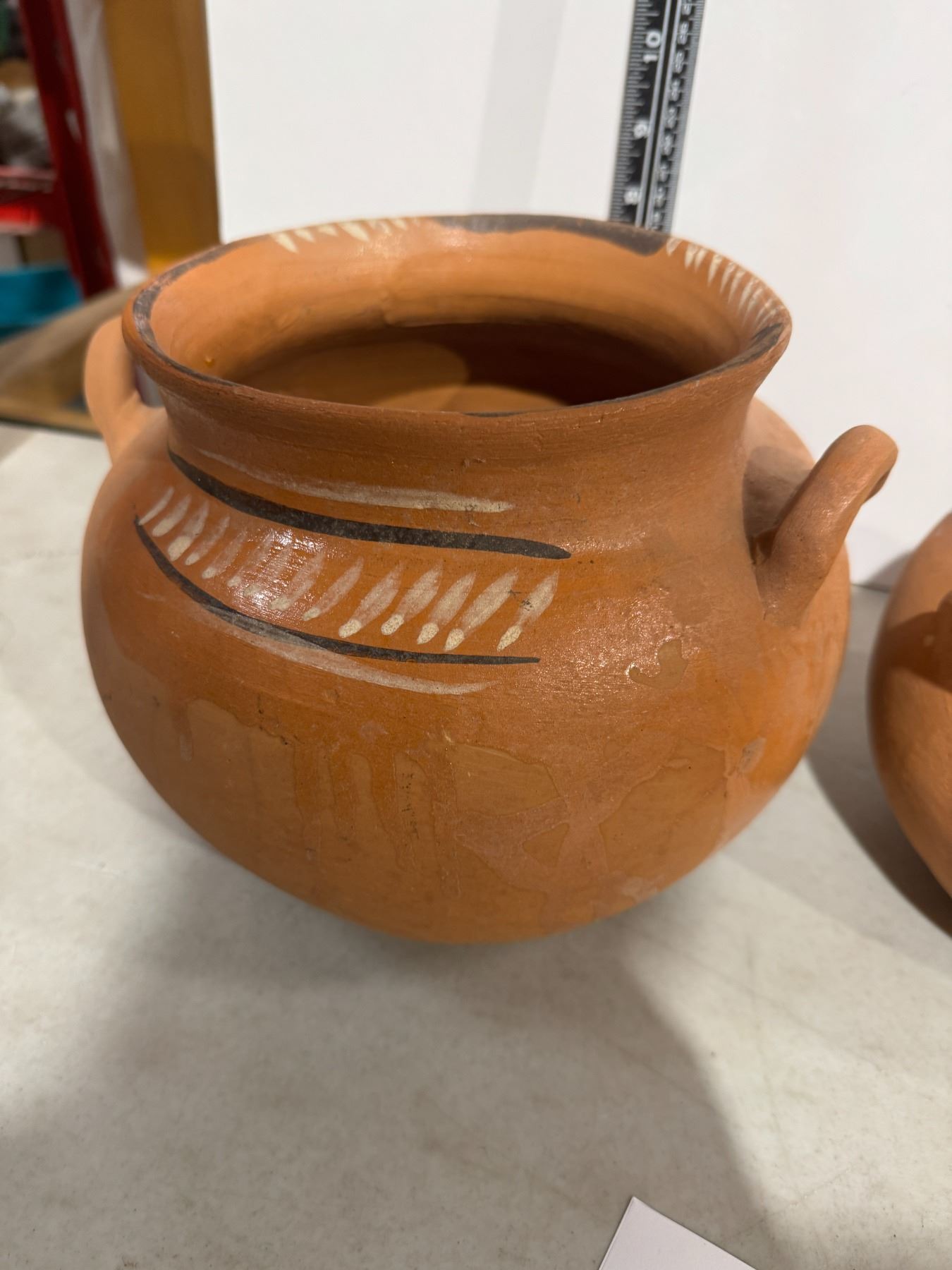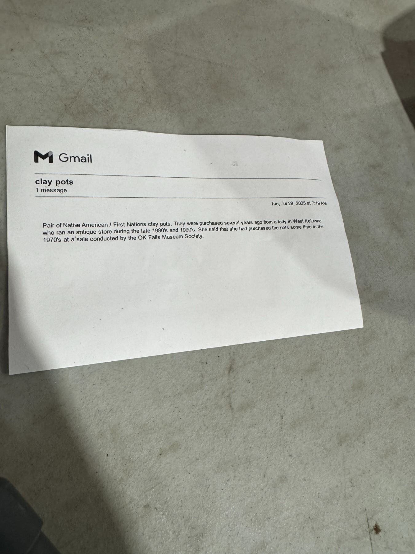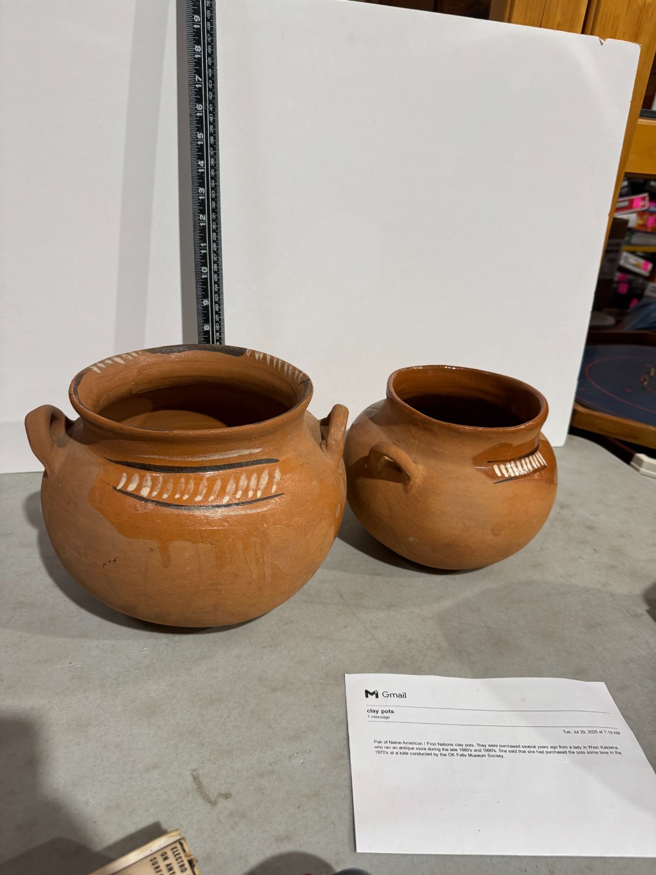 Pair of Native American/1st Nations clay pots. They were purchased several years ago from a lady in West kelowna who ran an antique storage during the late 1980s and 1990s she said that she had purchased the pots sometime in the 1970s at a sale conducted by the Kay Falls museum Society.