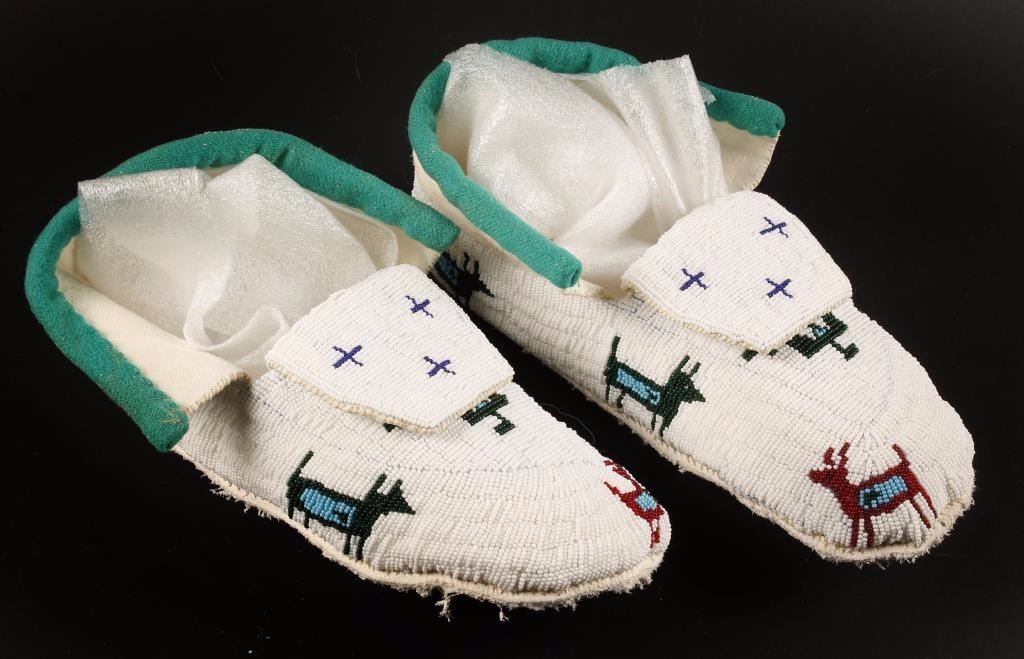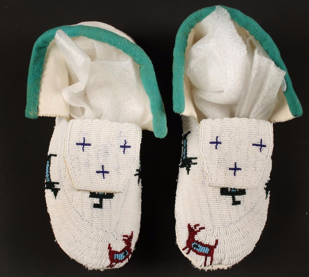 Accented with a buck design, all white beadwork with colored figures. Appears never to have been worn. Trading post type.