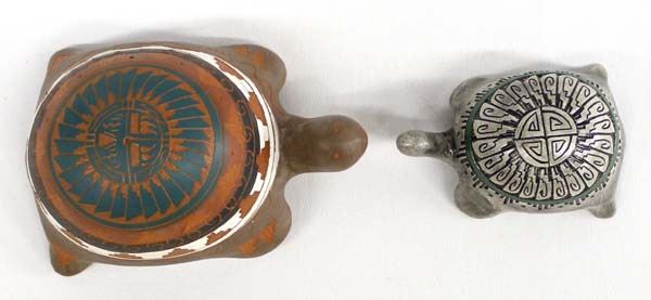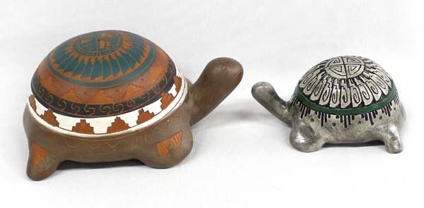 Pair of Native American Navajo Pottery Turtles, largest is 3'' X 4'' X 6'', marked Thaddeus Harding and V Tsosie