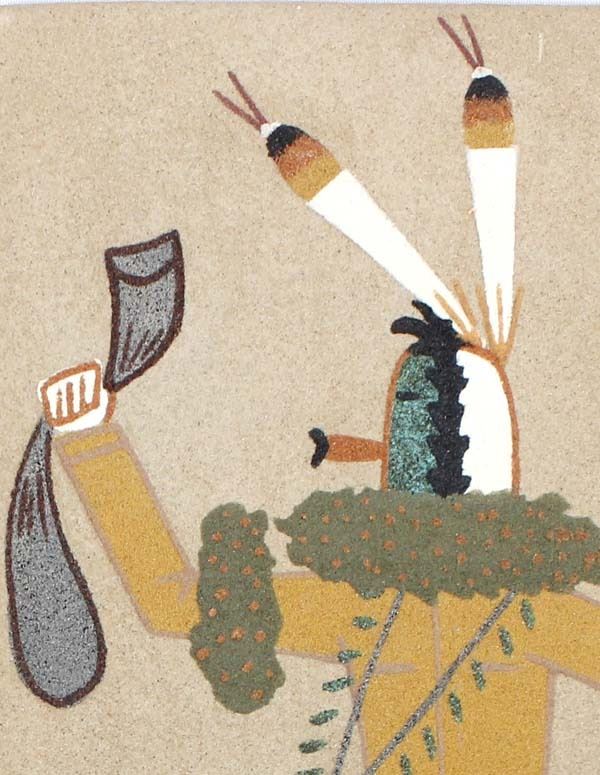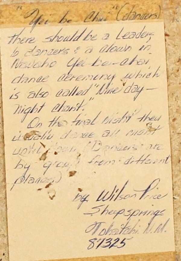 Pair of Native American Navajo Sand Paintings by Wilson Price of Sheep Springs Tohatchi, New Mexico, measure 16'' x 8'', includes 1. Yei-Bei-Chai (Talking God) information on the back 2. Yei-be-Chai (Dancers), information on the back