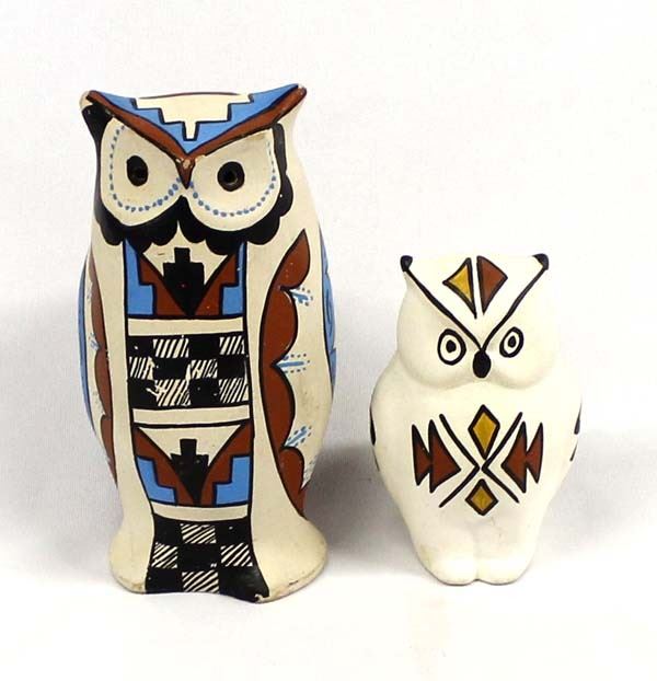 Pair of Native American Pottery Owls, includes: 1. Acoma Painted Ceramic Horned Owl, measures 3.5''H x 2.25''W x 2'' 2. Jemez Pottery Horned Owl by Sefora Yepa Tosa (1921-1987), measures 2.5'' x 5'' x 2.5'' and is signed on the bottom, paint loss on both horns