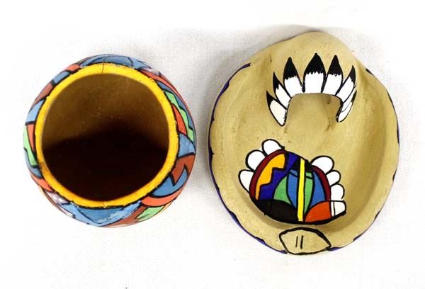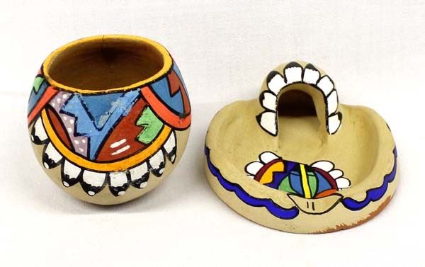 Pair of Native American Tesuque Pottery Pieces, poster painted, includes 1 jar and 1 horno oven, largest measures 1.5'' x 5'', the jar has a pressure crack