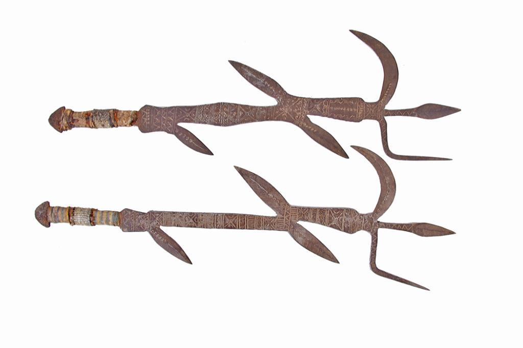 Pair of Native Throwing Knives With an intriquely etched blade and a unique snakeskin rack handle.With an intriquely etched blade and a unique snakeskin rack handle.