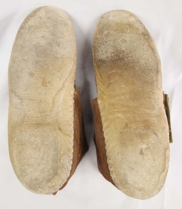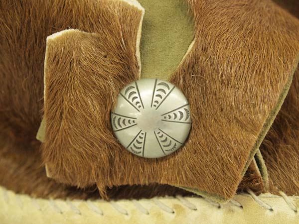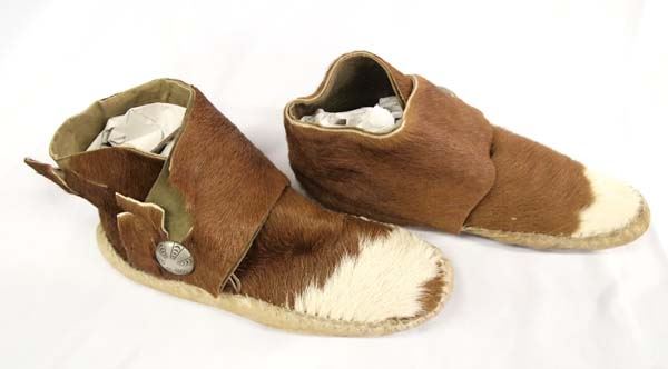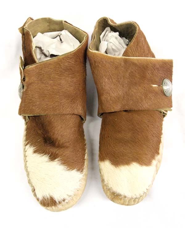 Pair of Navajo Cow Hide Moccasins. Brown and white in color each is has a concho and measure approx. 4''H x 10''L. They have fair to good shape soles. The right moccasin has a tear in the closure piece.