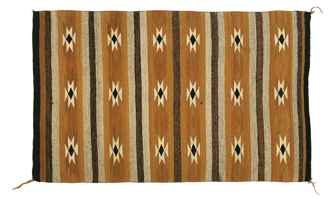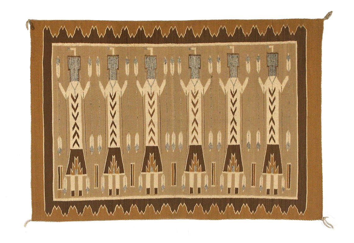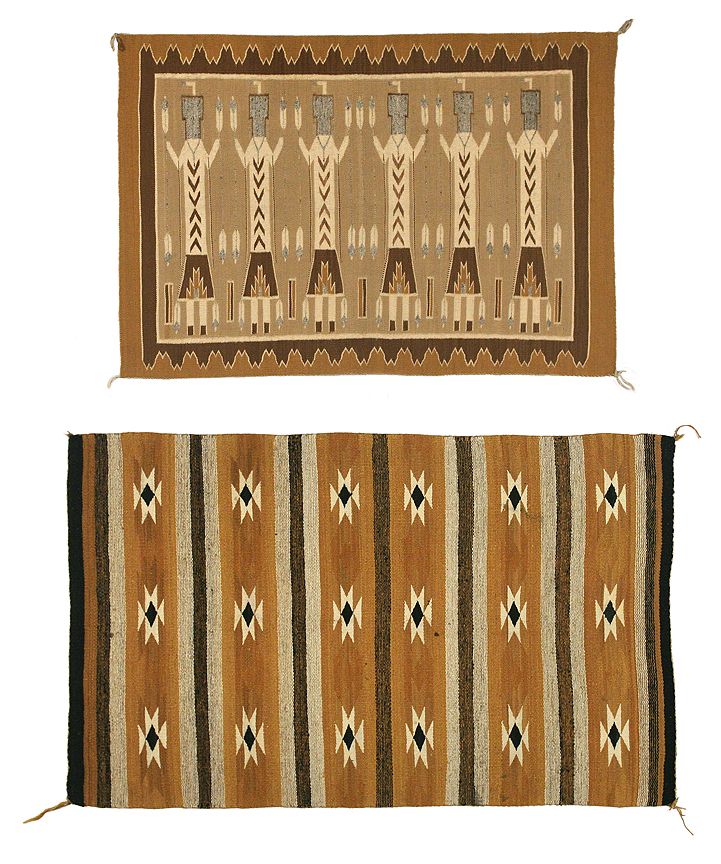 Pair of Navajo Crystal Weavings. 1. 4'1" x 2'11" Yei design. With first place ribbon - 1958 Navajo Tribal Fair, Arts& Crafts. 2. 5'1" x 3'2" banded geometric designs. Both circa 1950s. (est. $1,000-1,500). CONDITION REPORTS: www.auctioninsantafe.com/docs/cr2012.pdf