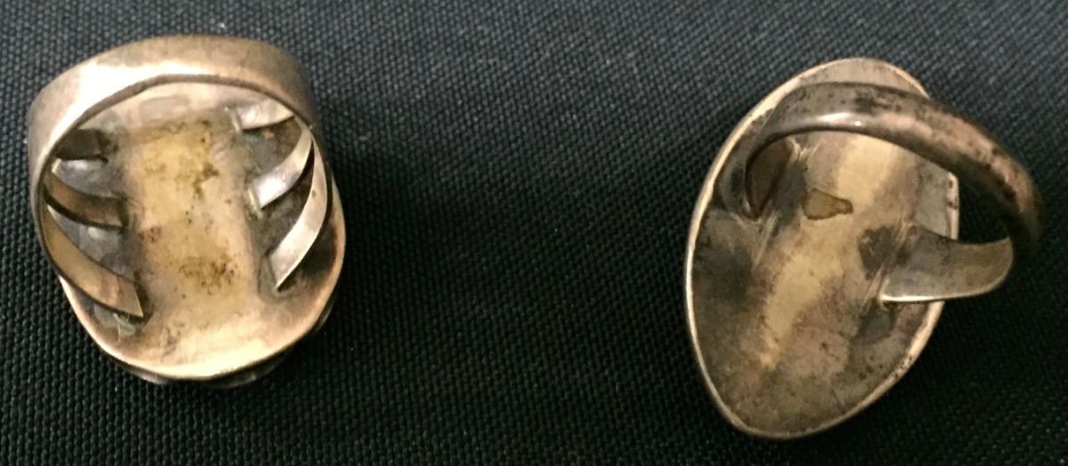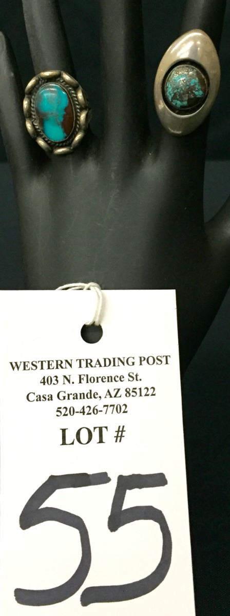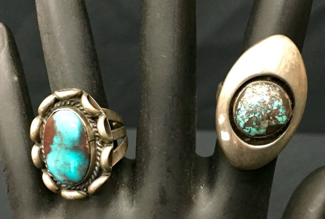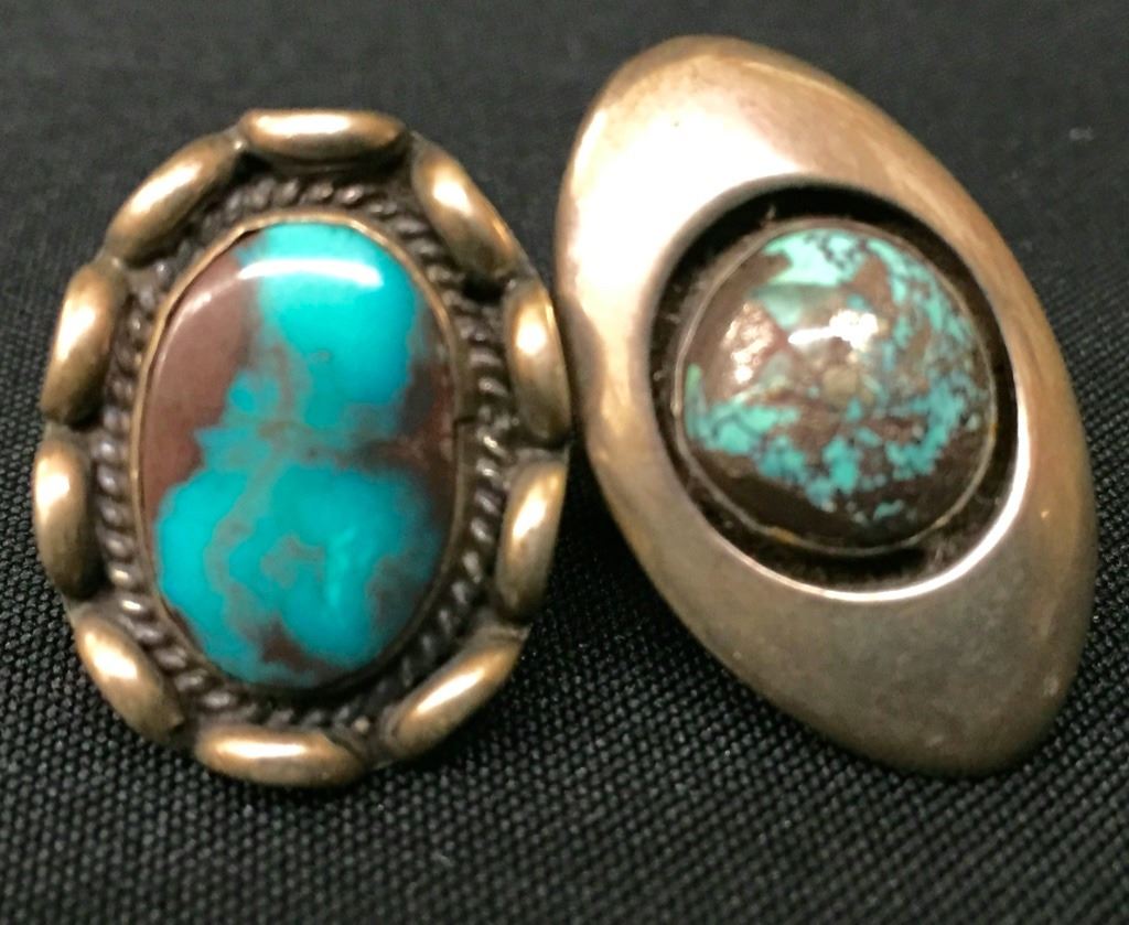 Both of these rings are set and Sterling and have very nice turquoise cabochons. Please note there is a crack in the cabochon that looks like it may be Bisbee. Sizes 3.5 and 4.5. Collectively they weigh 14.3 g. Please look closely at the pics as they are an important part of our description. Shipping: There will be a $5 handling / packaging fee for shipping this lot. The actual cost of postage will be added on top of that.
