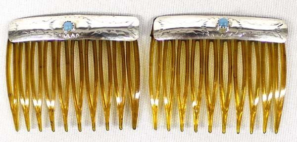 Pair of Native American Navajo Sterling Turquoise Hair Combs, measure 2'' x 2'', pretty hand stamped details