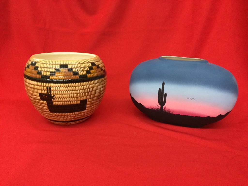 You get 2 handpainted, Navajo Style pots for 1 money in this lot! They measure approx. 7” tall. Both are in very nice condition.