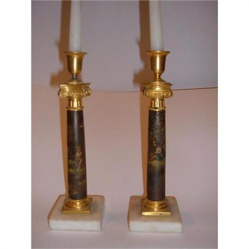 A wonderful pair of Neo-classical candlesticks of gilt bronze, marble, Vernis Martin type lacquer on leather, decorated with neo-classical figures.