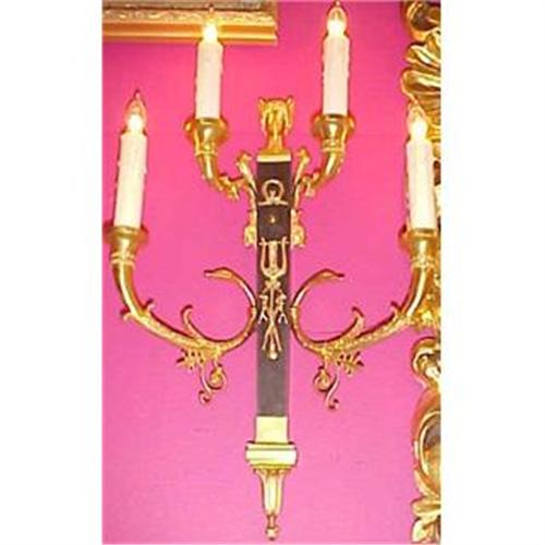 This is a fabulous pair of French Neoclassical Bi-Color Empire Sconces with 3 beeswax candlestick lights. If you're looking for an "Uber Premium" item to light up your wall....this pair is it! An item for the connoisseur with an eye for quality.