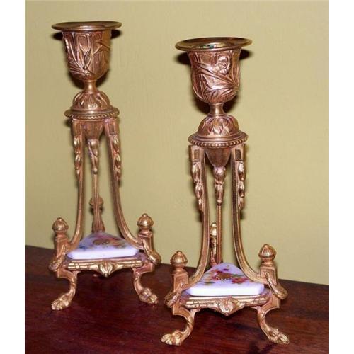 Here we have a very lovely pair of gilt metal candlesticks with very nice casting in a neoclassical style. The candle cups have flowers and foliage superimposed on a paneled surface, bell flowers drop down the legs and from the center, posts on the legs with laurel wreaths and paw feet. In addition there is a porcelain inset attached to the base with a gilt metal rosette. These are 7" high and date to the early 20th century. Excellent condition. (These do not lean as the photo implies. Maybe I have a slight list.)