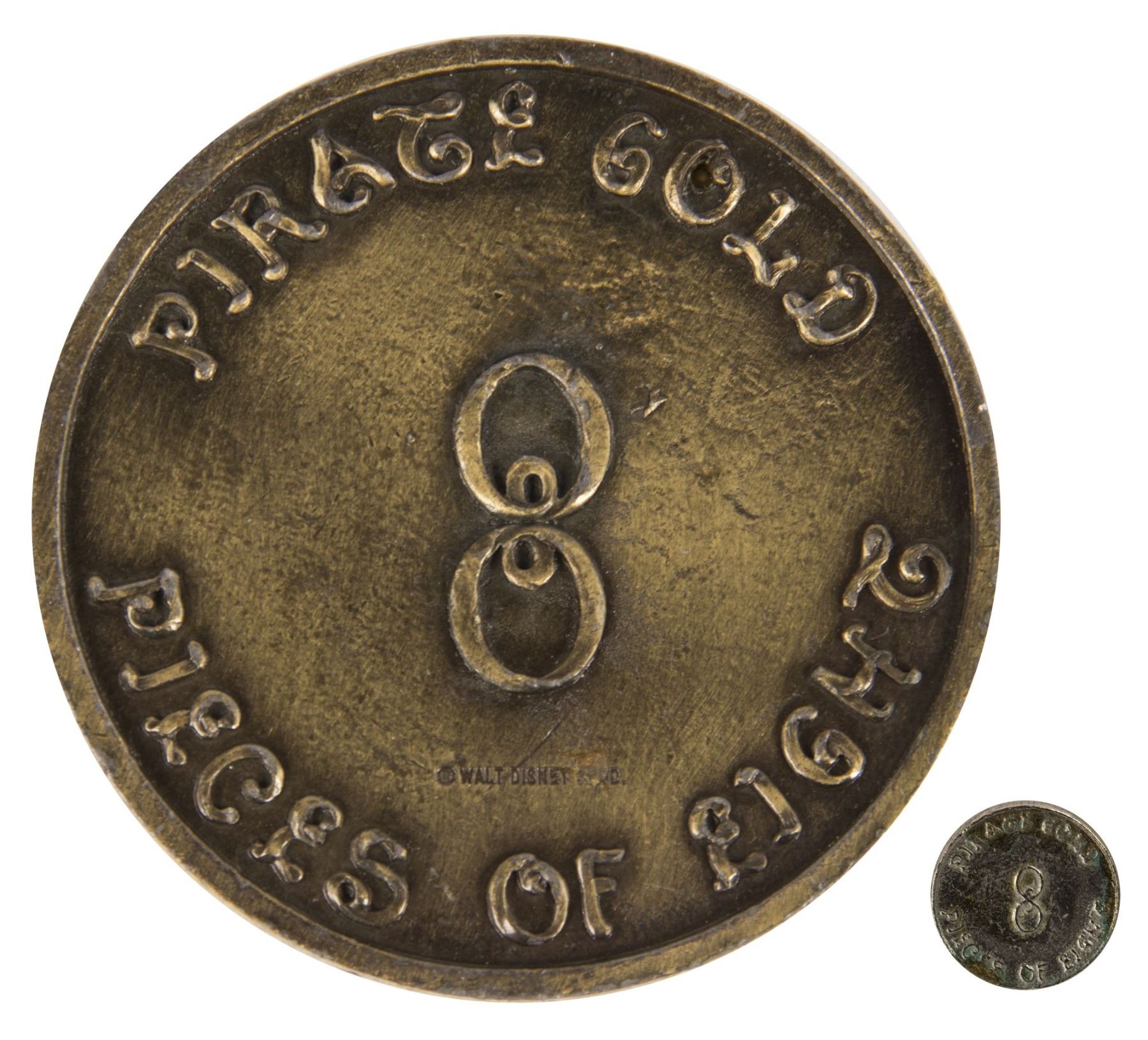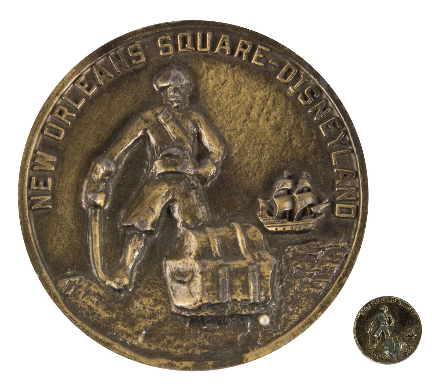 (Disneyland, c.1967) A pair of souvenir coins from Disneyland's Pieces of Eight gift shop in New Orleans Square. Both coins feature great pirate imagery and read "New Orleans Square" along the top, with the larger coin bearing an additional "Disneyland." The coins range in size from 0.75" to 3.25" in diameter and are in very good condition. The smaller coin shows some discoloration to the surface from age, while the larger coin shows surface-wear to the embossed image.