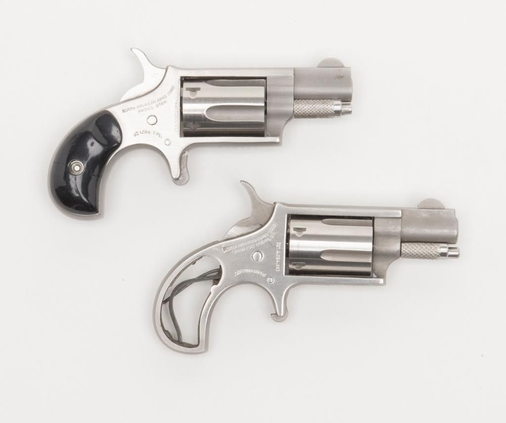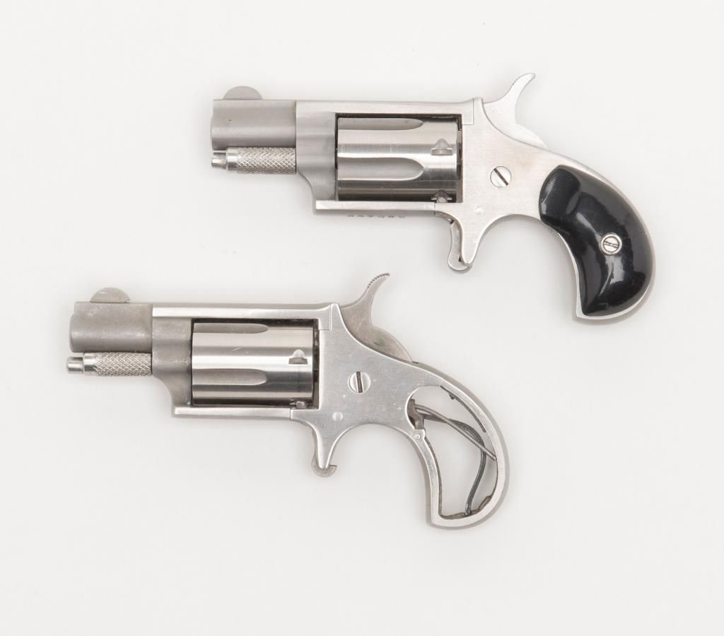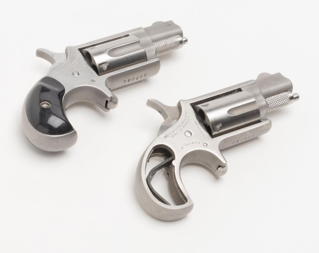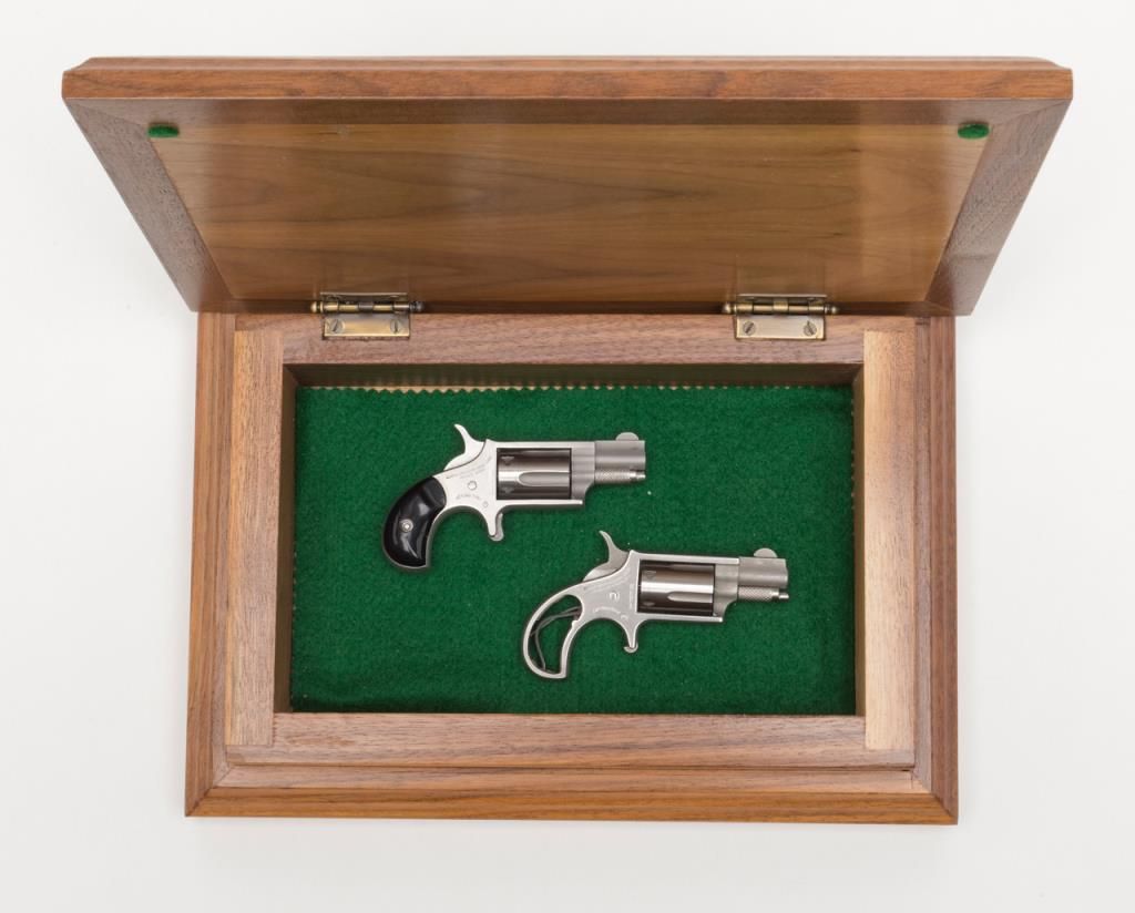 Pair of North American Arms Corp. mini-derringers in custom wood casing: 1. .22LR cal., 1-1/8” barrel, spur trigger, stainless, black plastic grips, #B57082, in overall fine condition with crisp action, fine bore, grips show hairlinecracks at escutcheons. 2. .22LR cal., 1-1/8” barrel, spur trigger, stainless, black plastic grips, #C56410, in overall very good + condition with crisp action, fine bore, missing grips; custom wood case is overall fine. From theestate of Joe Kiser. (Modern/No Sale to Calif. Residents). Est.: $150-$300.