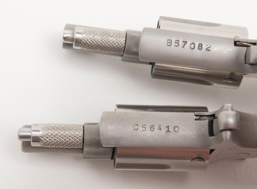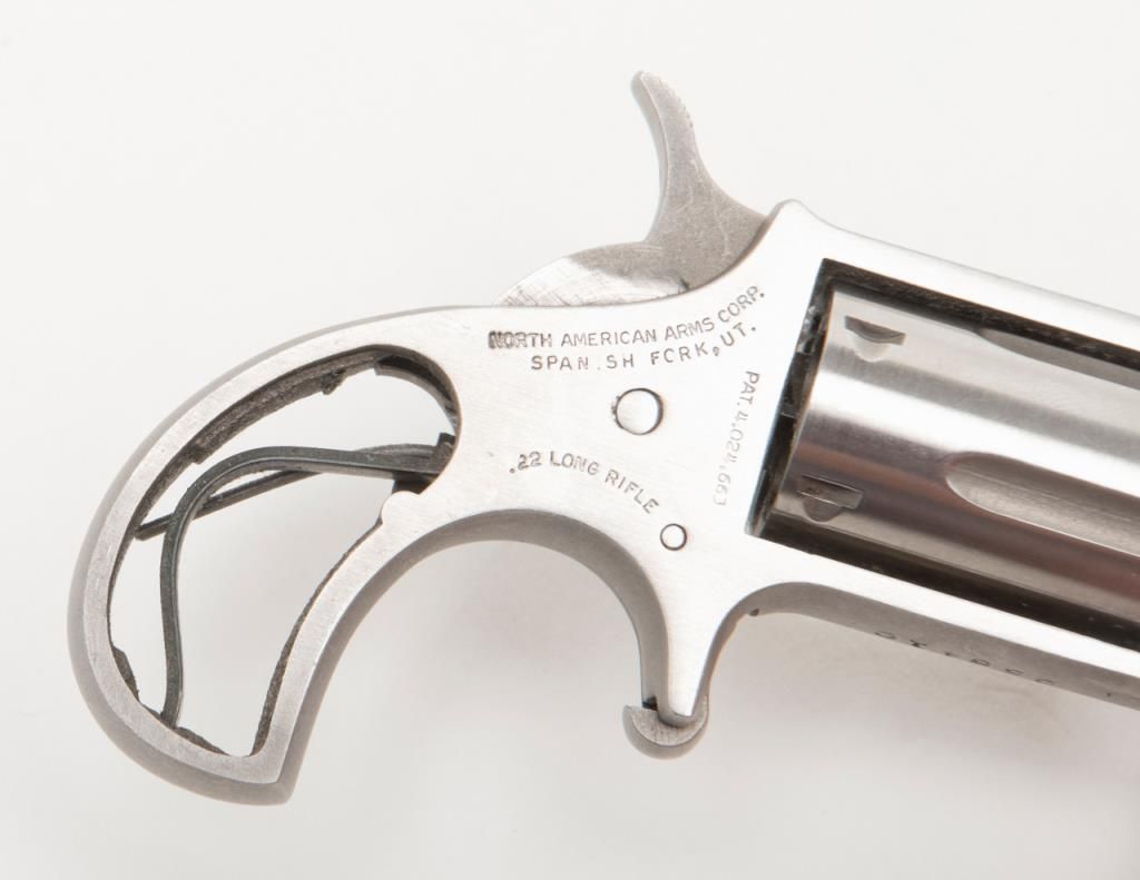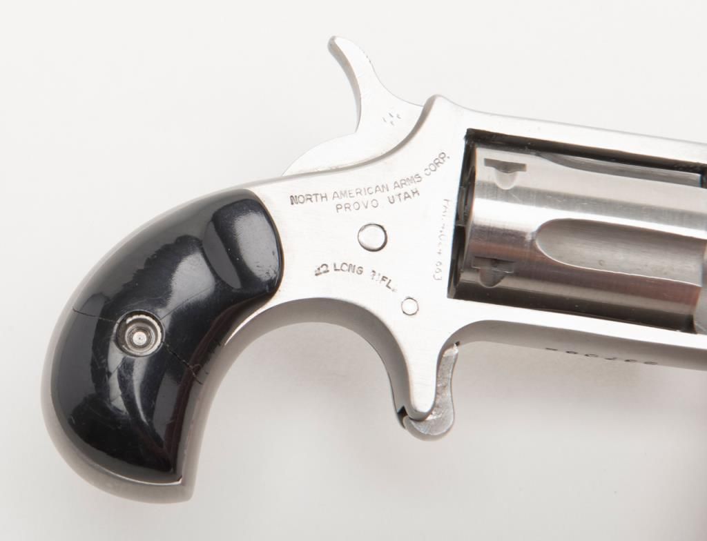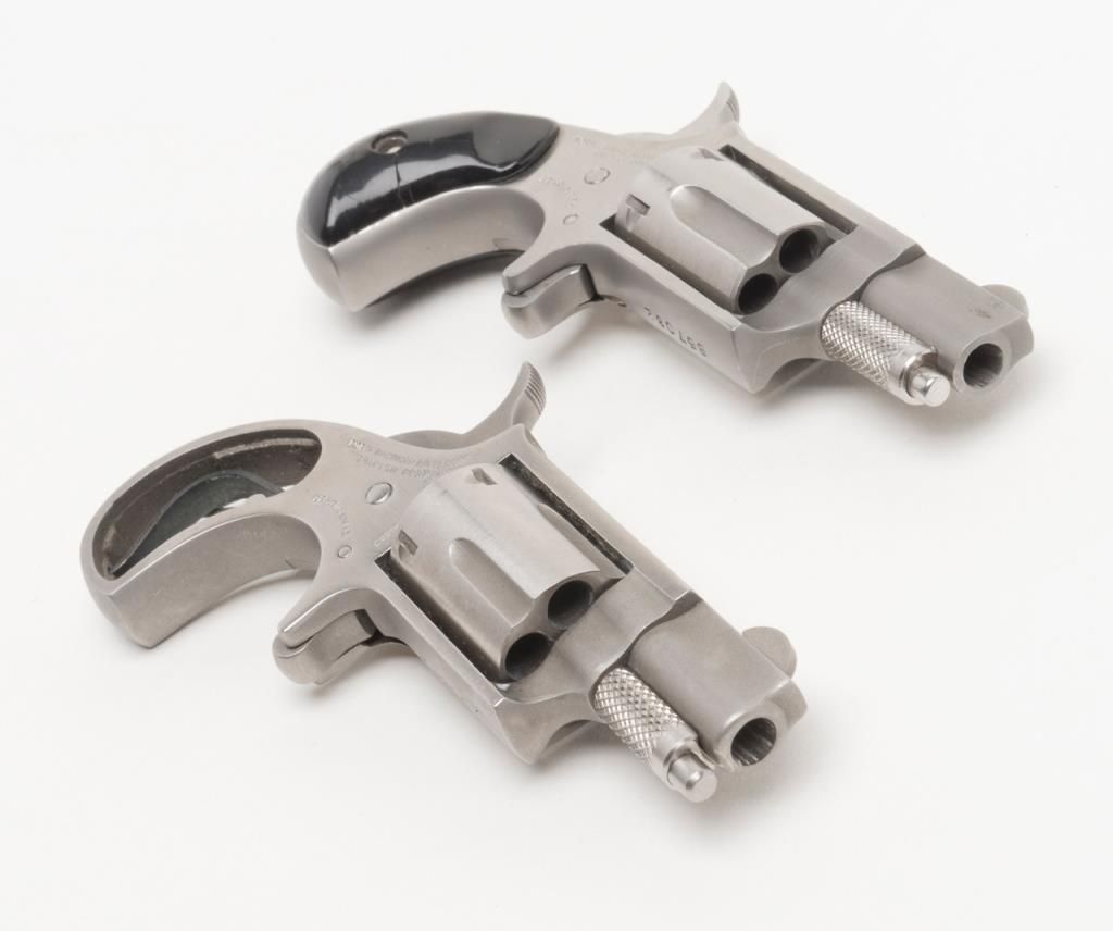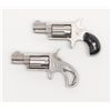 Pair of North American Arms Corp. mini-derringers in custom wood casing: 1. .22LR cal., 1-1/8” barrel, spur trigger, stainless, black plastic grips, #B57082, in overall fine condition with crisp action, fine bore, grips show hairlinecracks at escutcheons. 2. .22LR cal., 1-1/8” barrel, spur trigger, stainless, black plastic grips, #C56410, in overall very good + condition with crisp action, fine bore, missing grips; custom wood case is overall fine. From theestate of Joe Kiser. (Modern/No Sale to Calif. Residents). Est.: $150-$300.
