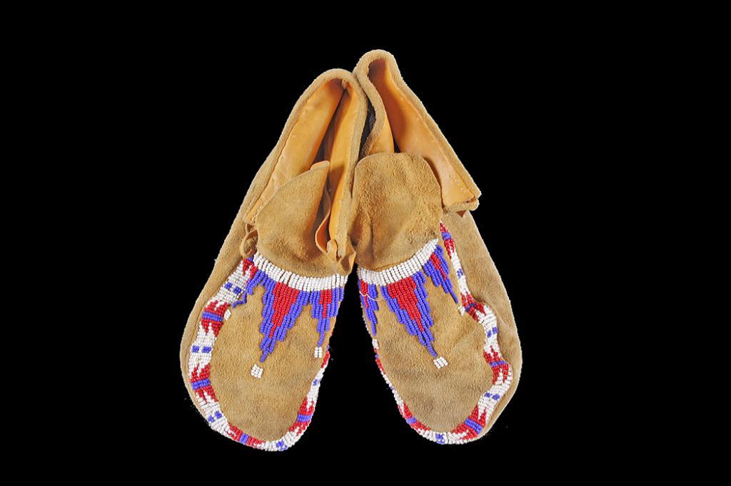 Pair of Northern Paiute Men's Moccasins Decorated with beaded geometric designs, Circa 1930s.Decorated with beaded geometric designs, Circa 1930s.