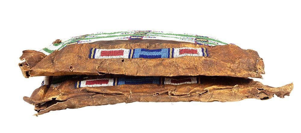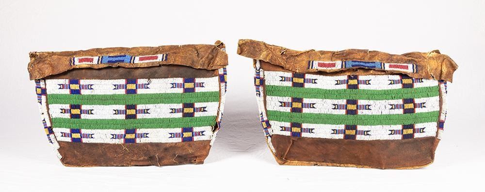 15" x 22" overall, beaded in classic geometric banded designs of green, white, greasy yellow and white heart red beads. 19th century.
