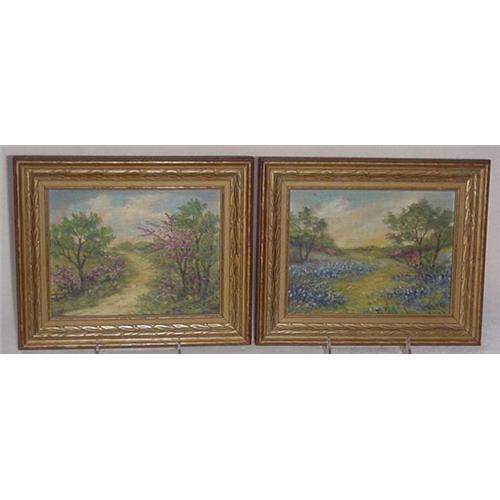 A pair of framed oil paintings, 10 1/2" X 8 1/2", framed size. Two landscape views signed V.E. Lange lower right. Painted on artist board and framed in attractive gold frames. Condition is very good.