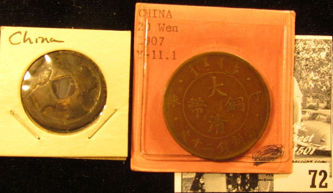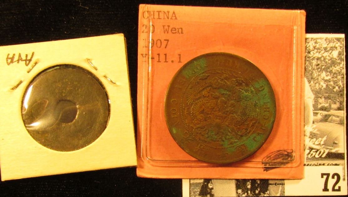 Pair of Old Chinese Copper Coins, one of which is a 1907 China 20 Wen, Y11.1.