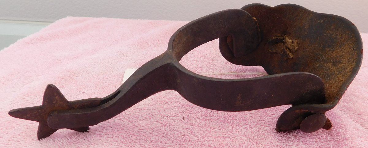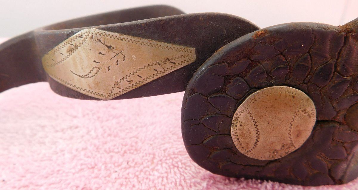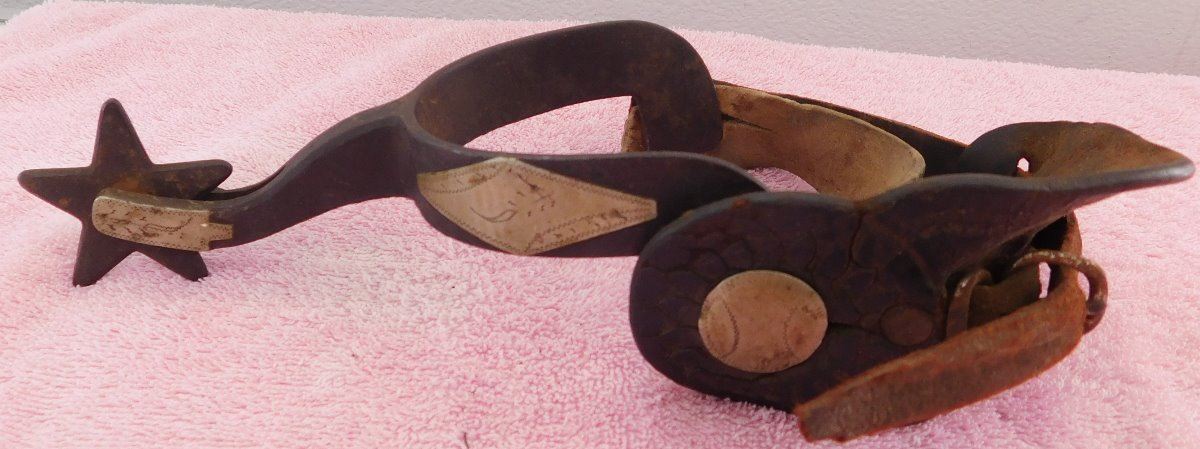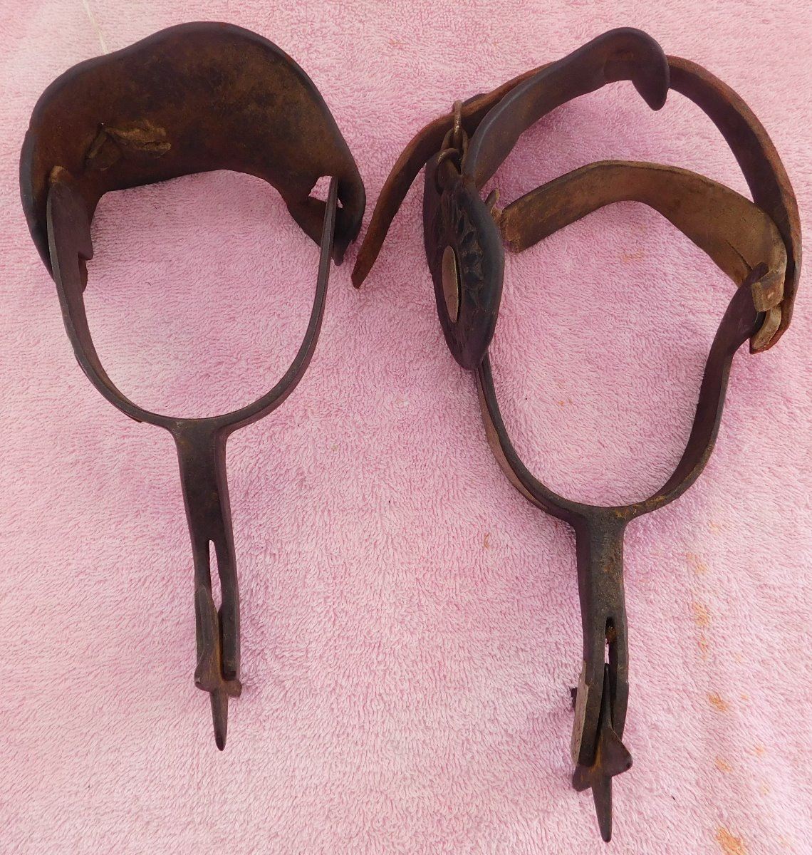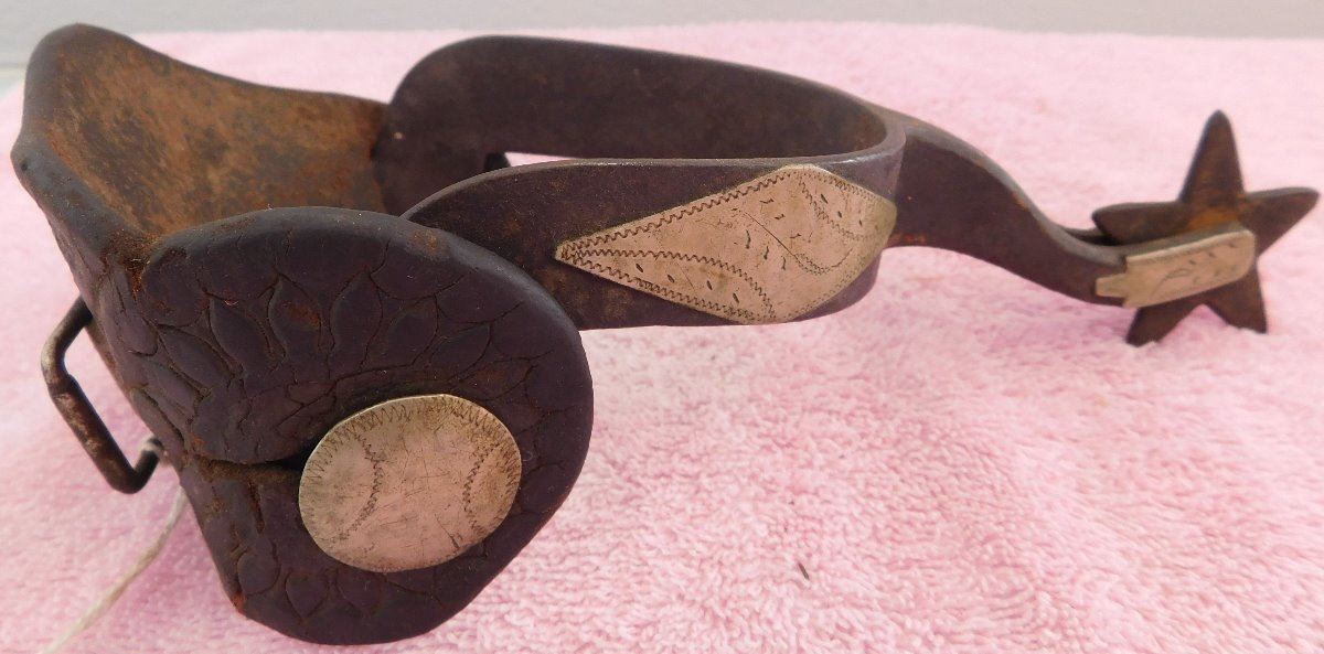 Pair of Old Cowboy Spurs, circa 1920s. Made of leather, silver and iron, the items measure 10" x 4" x 2.75" and 8" x 4" x 2.75". From Colorado. Condition: Some rust and wear, see images. Shipping: $22.50 w/insurance and signature.